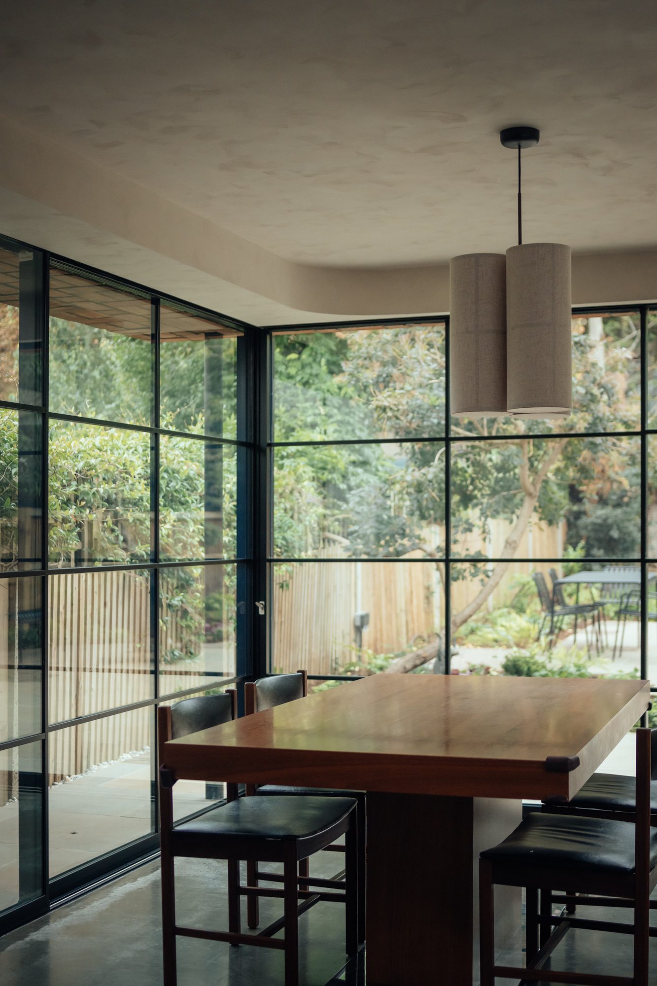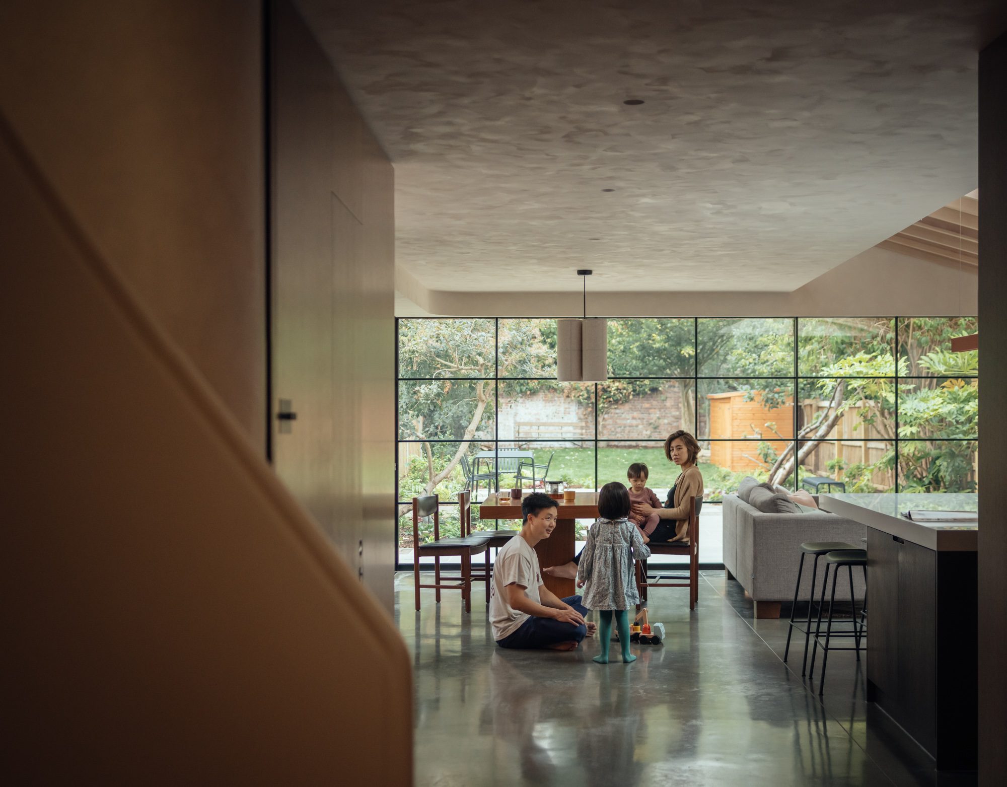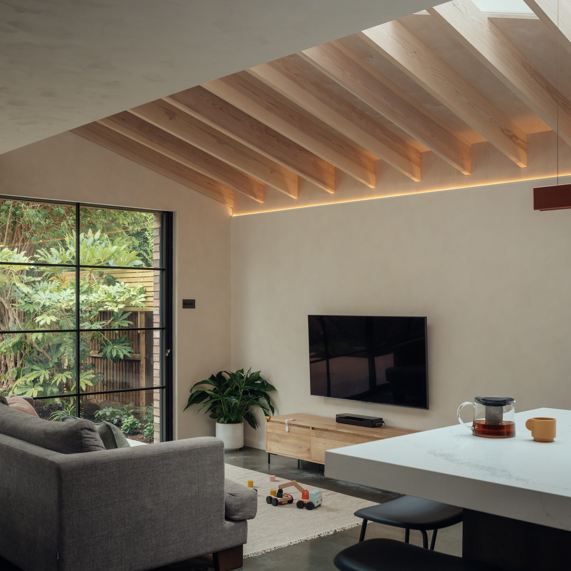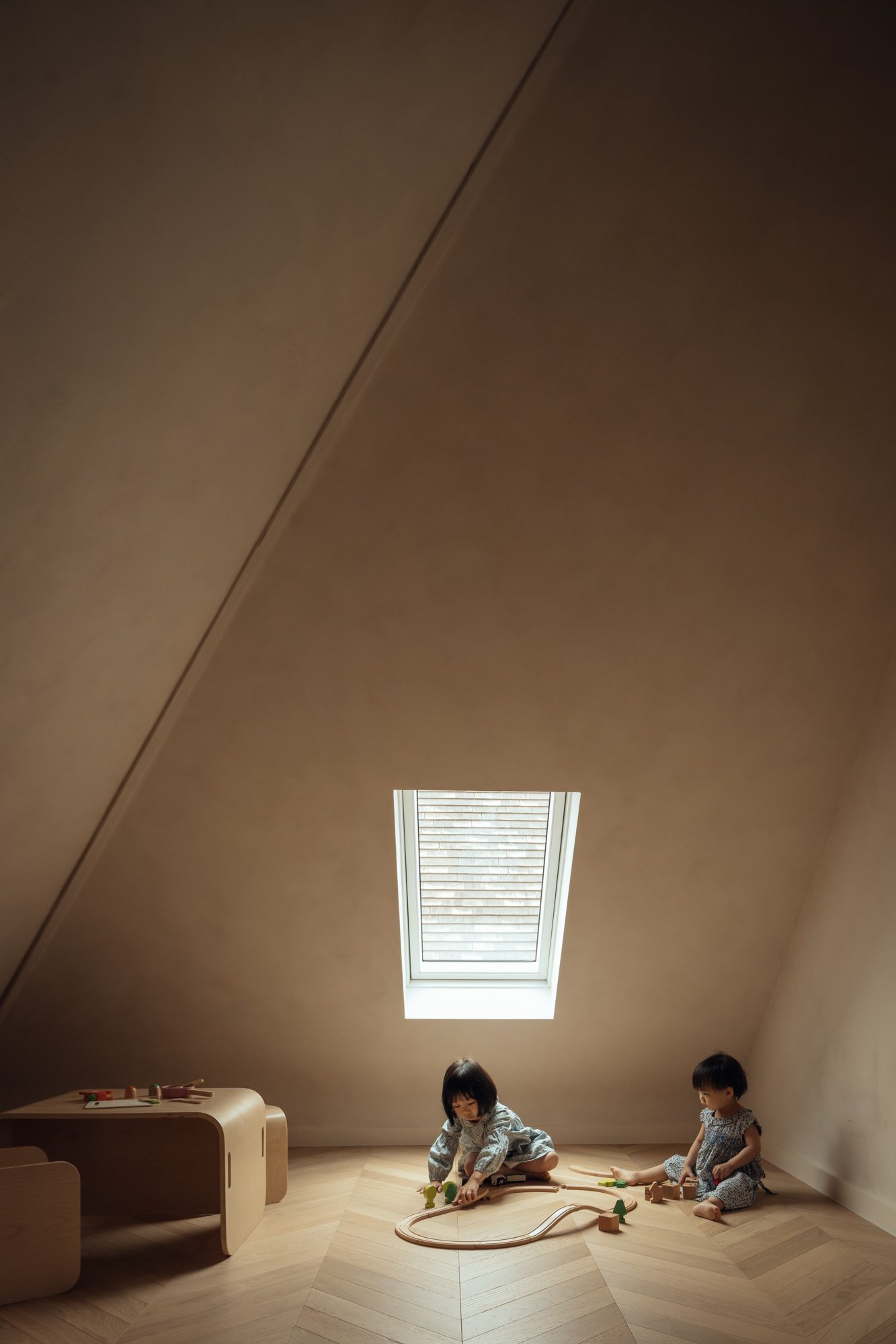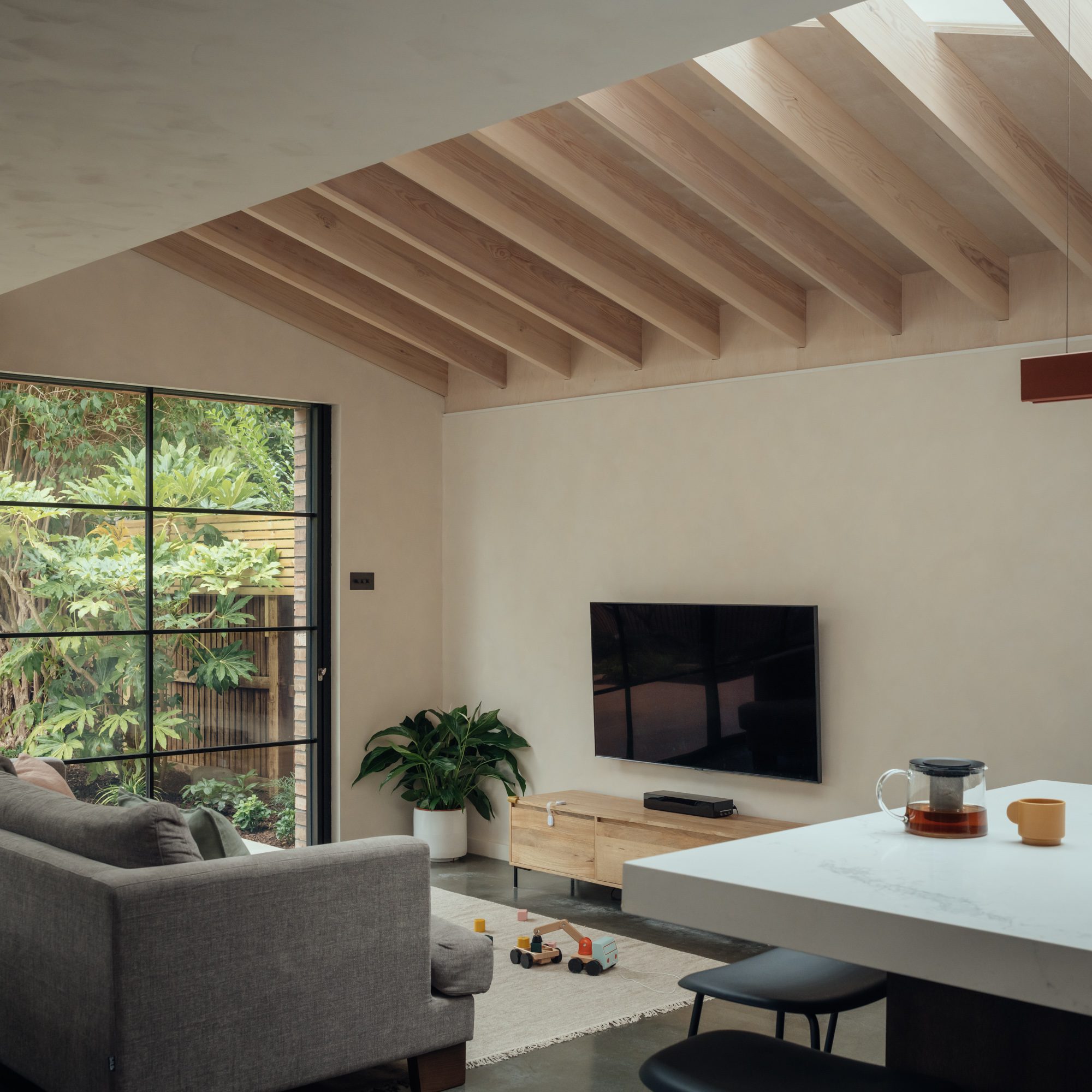 The interior palette is simple yet elegant, featuring timber and lime-washed plaster. High-performance glazing and retrofitted insulation enhance comfort and energy efficiency. In hot weather, the open stair void with a rooflight acts as a natural ventilation system.