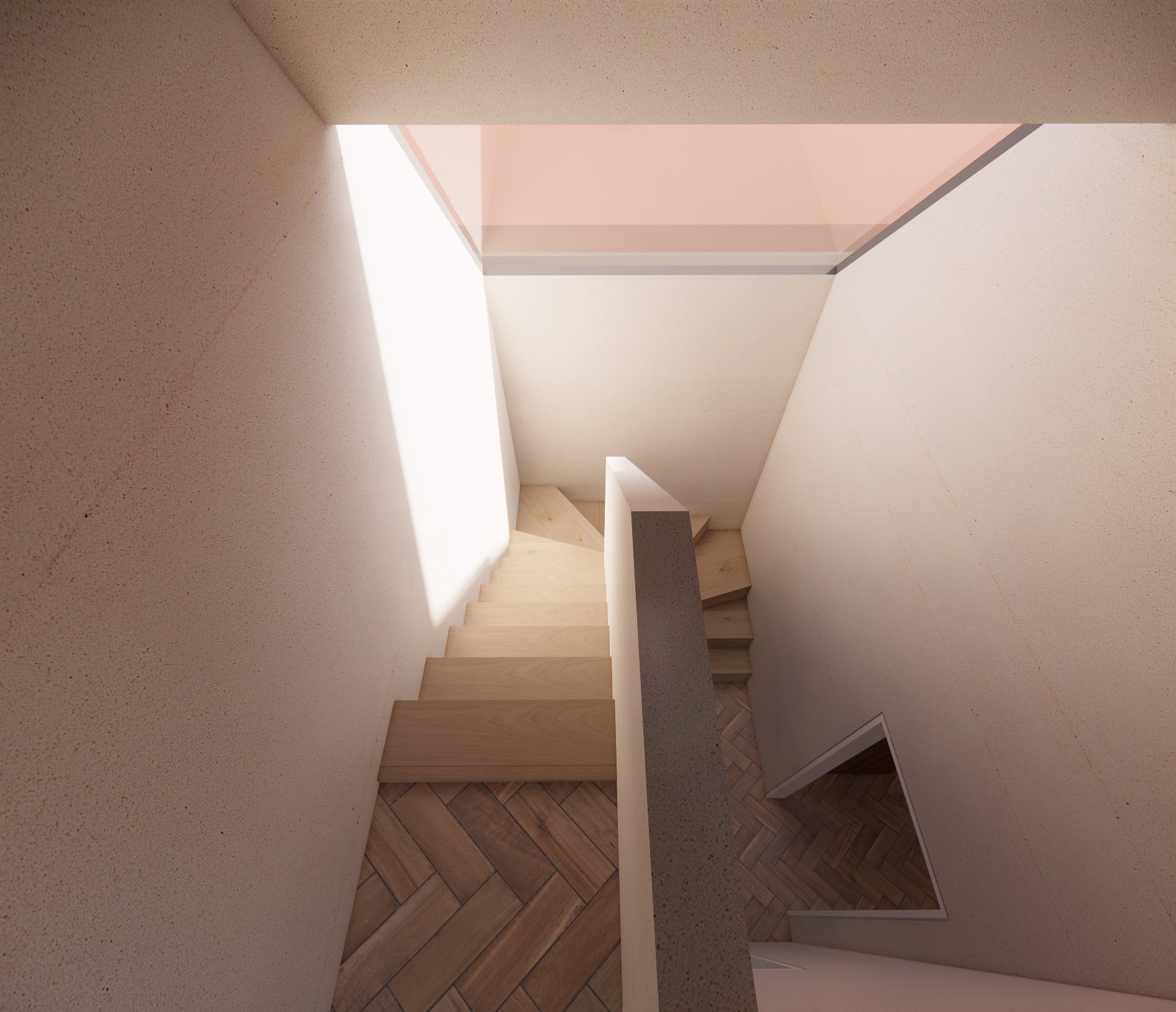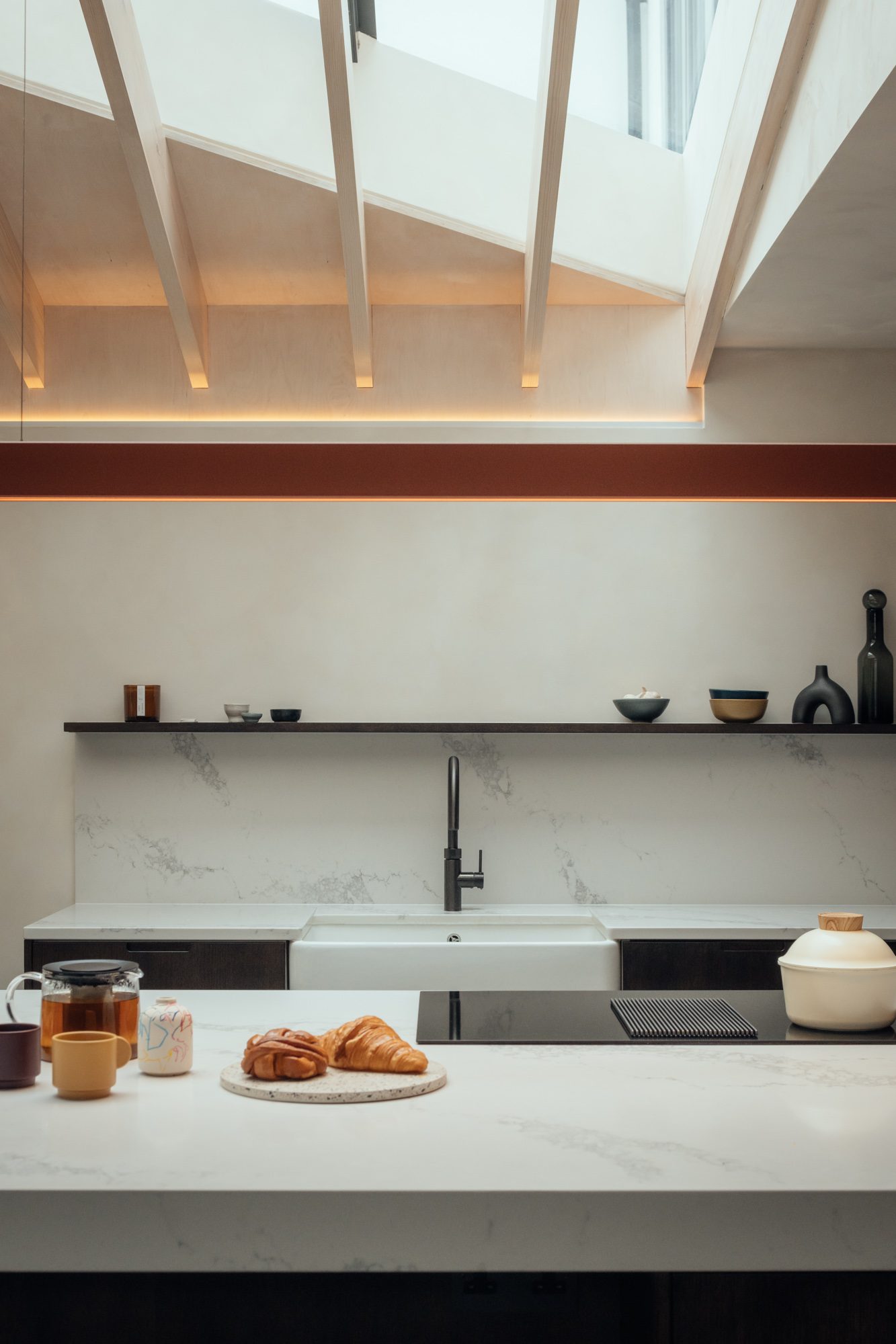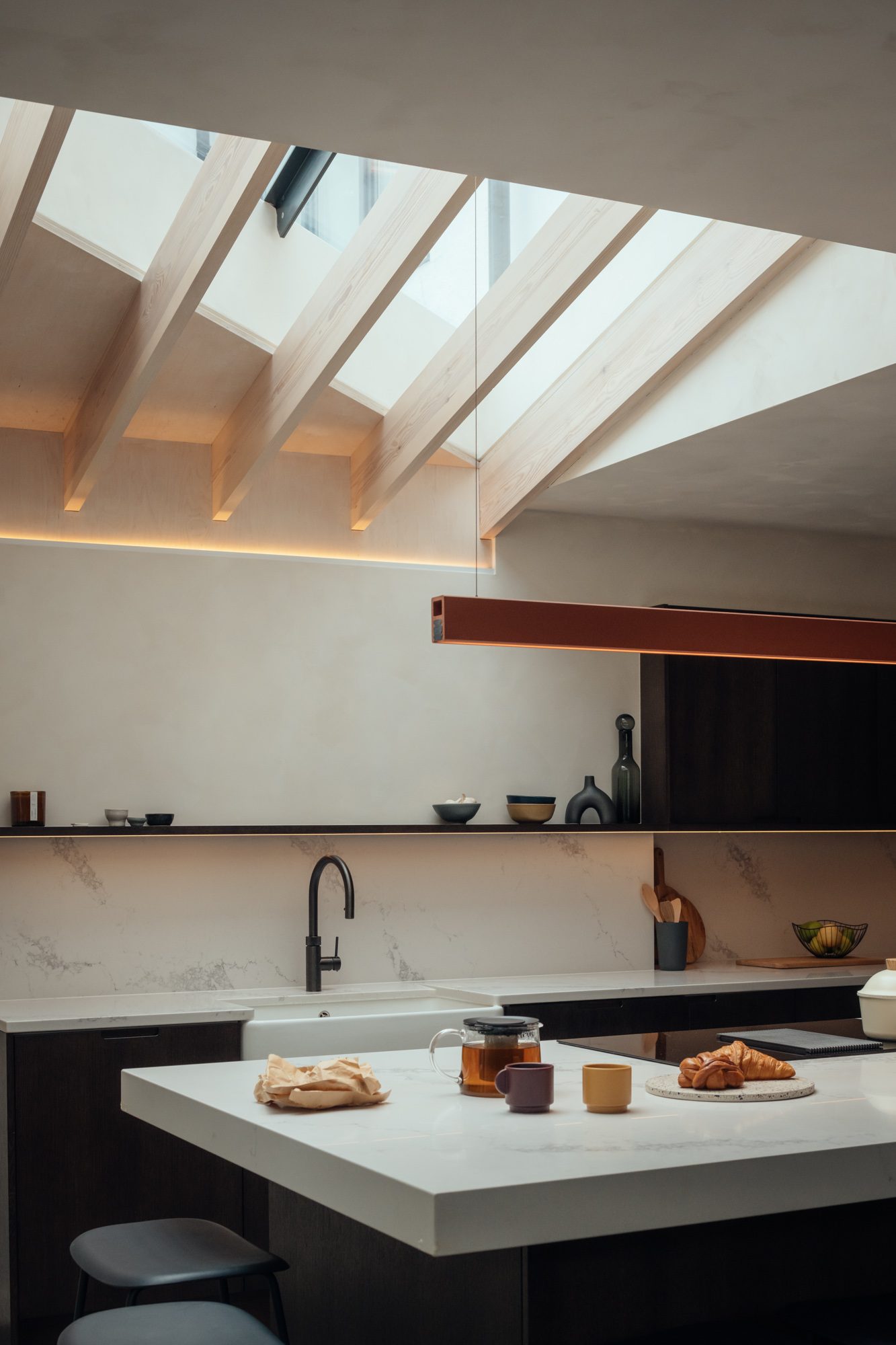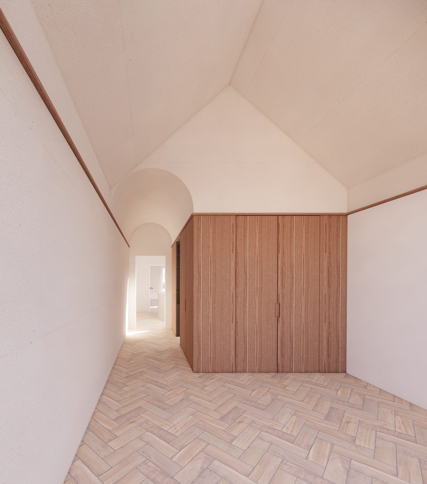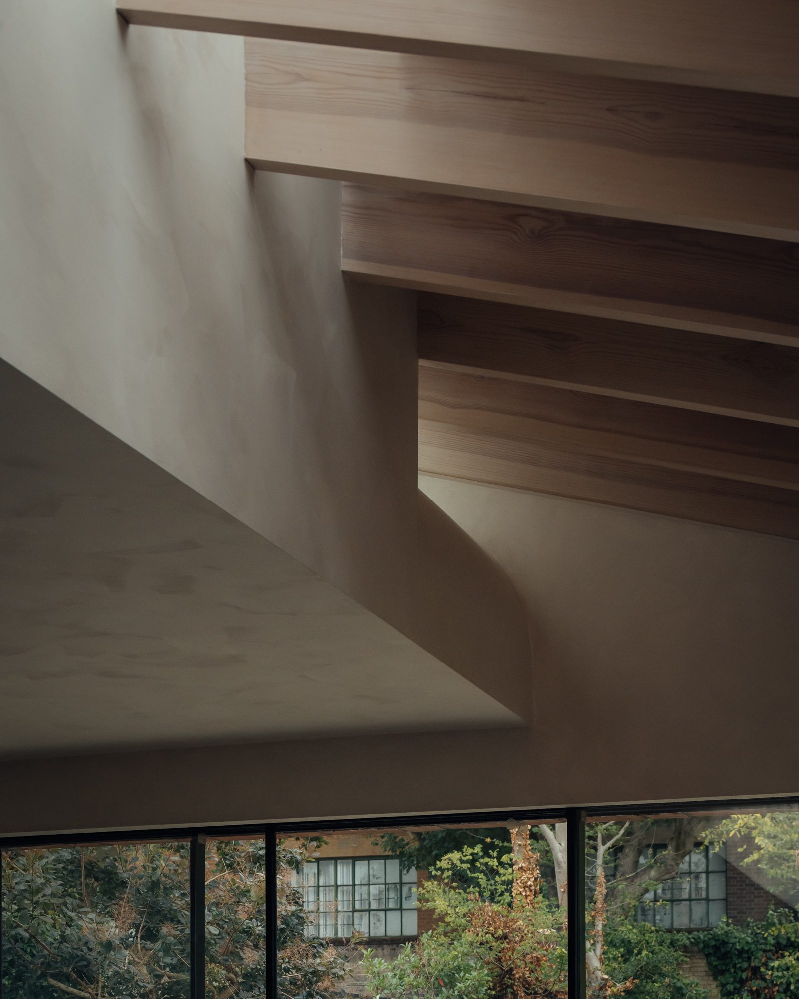 The interior palette is simple yet elegant, featuring timber and lime-washed plaster. High-performance glazing and retrofitted insulation enhance comfort and energy efficiency. In hot weather, the open stair void with a rooflight acts as a natural ventilation system.