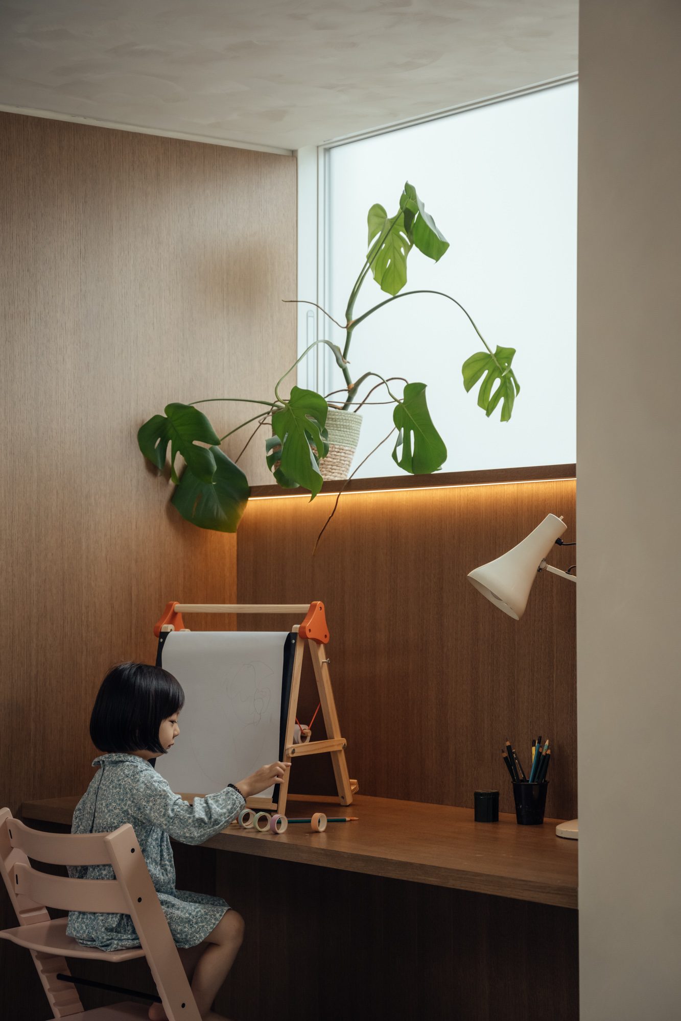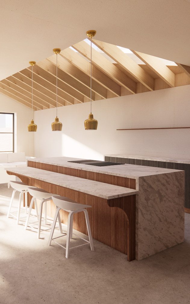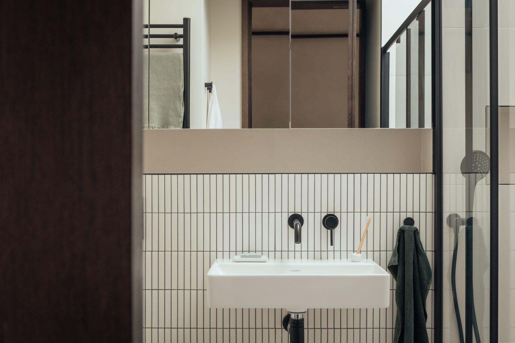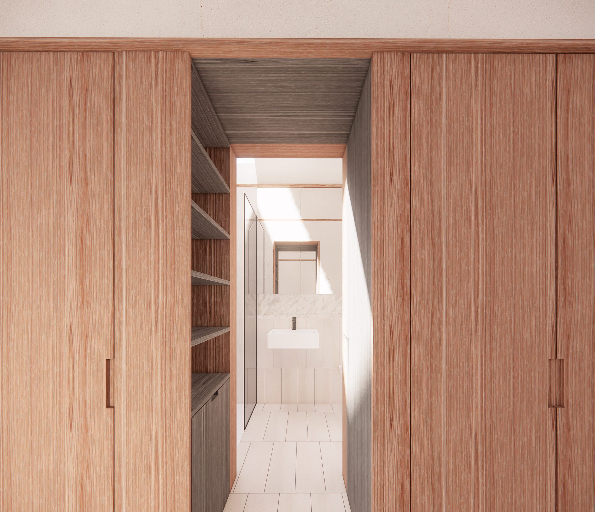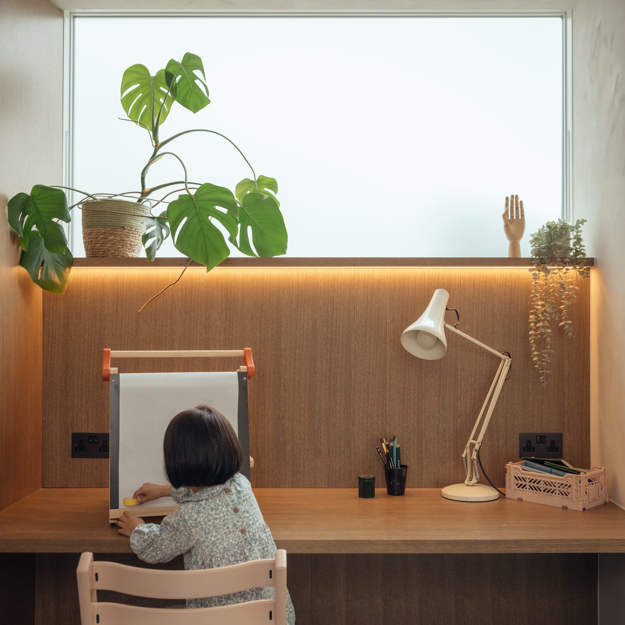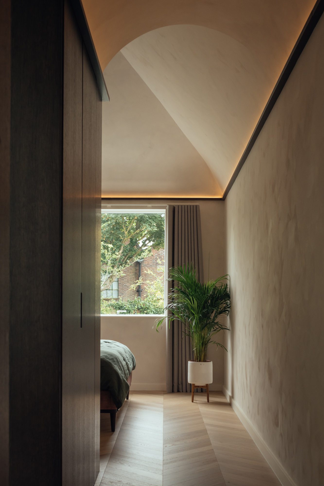 The interior palette is simple yet elegant, featuring timber and lime-washed plaster. High-performance glazing and retrofitted insulation enhance comfort and energy efficiency. In hot weather, the open stair void with a rooflight acts as a natural ventilation system.