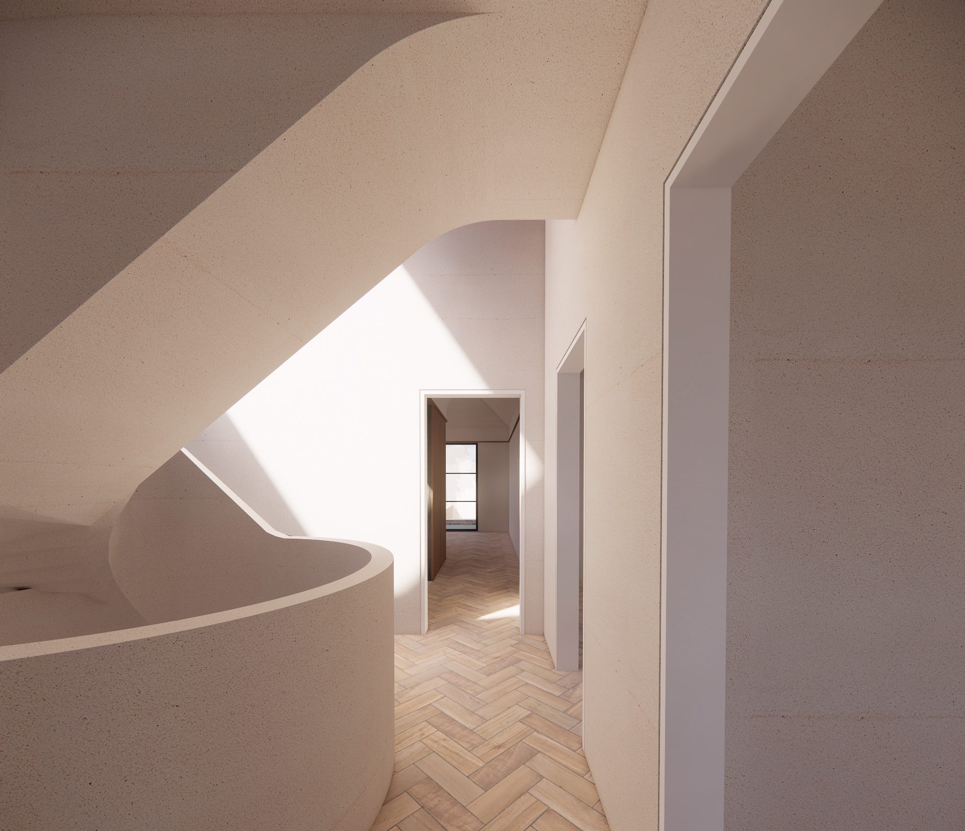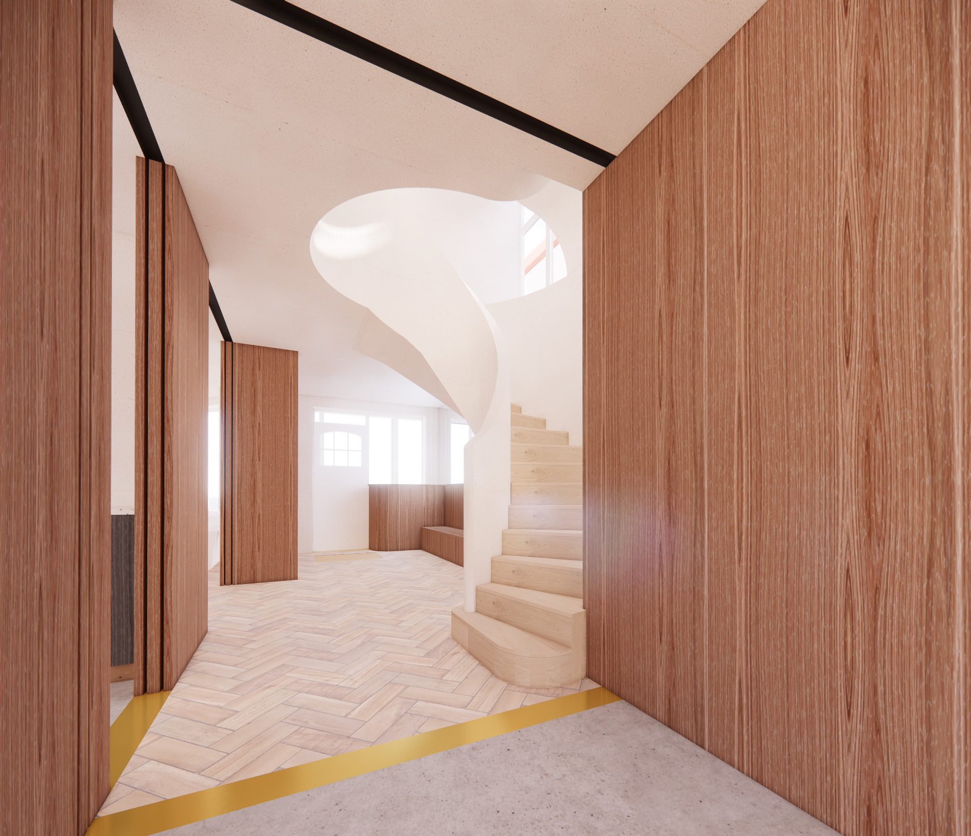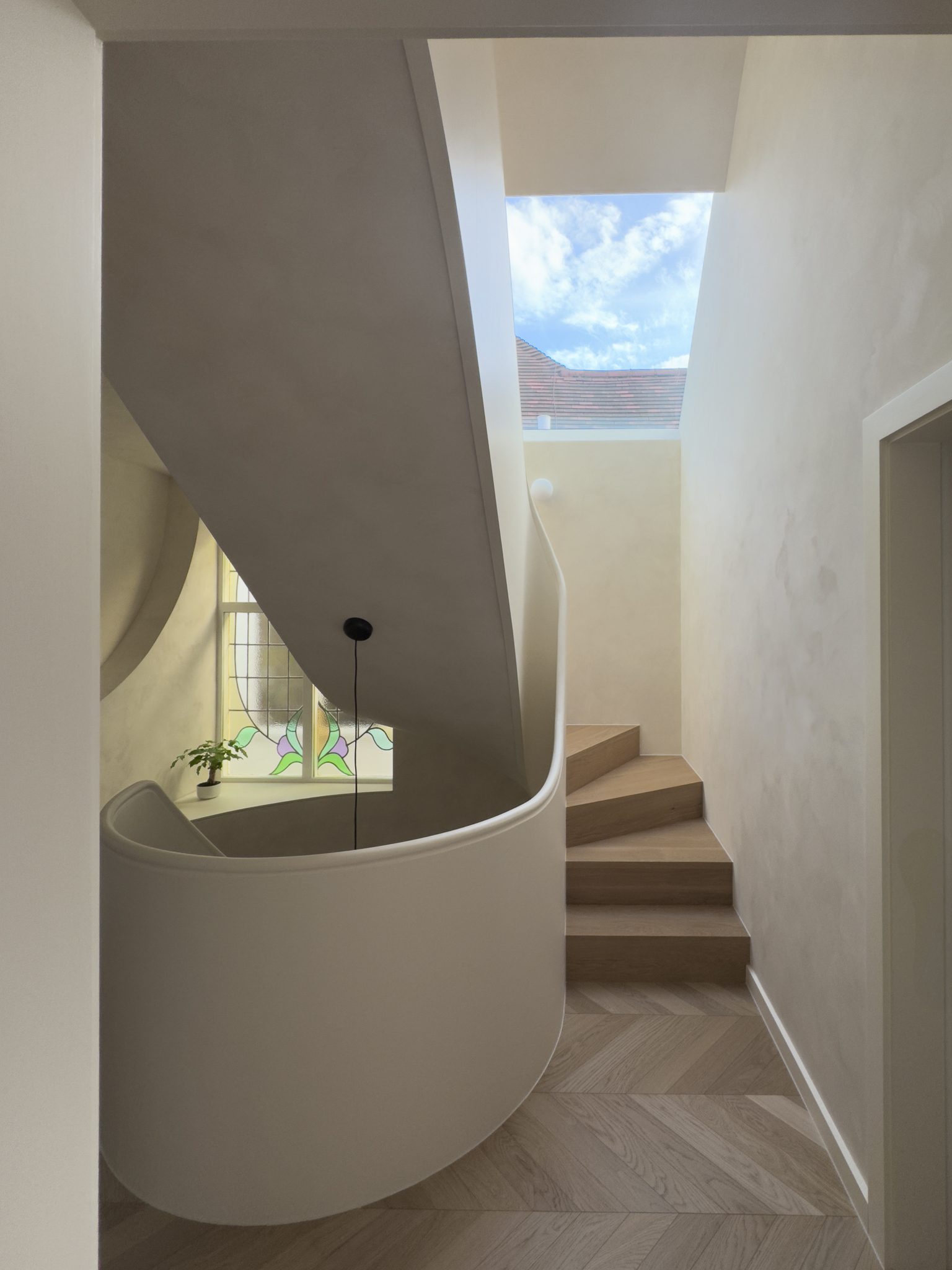 One of the standout features is the ground floor extension, which perches impressively on the corner of the new brick form, adding a touch of architectural drama. There are further features which inspire delight inside – a sculpted staircase winds gracefully from the expanded entrance hall to the loft, with a continuous handrail that leads past an original stained glass window and under a wide opening rooflight. This spiral staircase is not just a functional element but a piece of art, playing with geometry and light to create dynamic visual interest.
