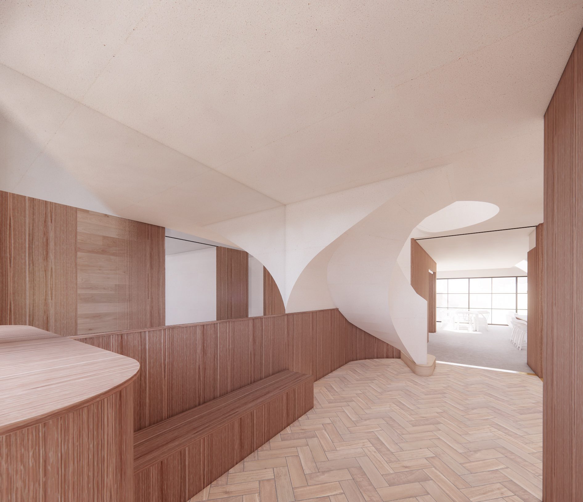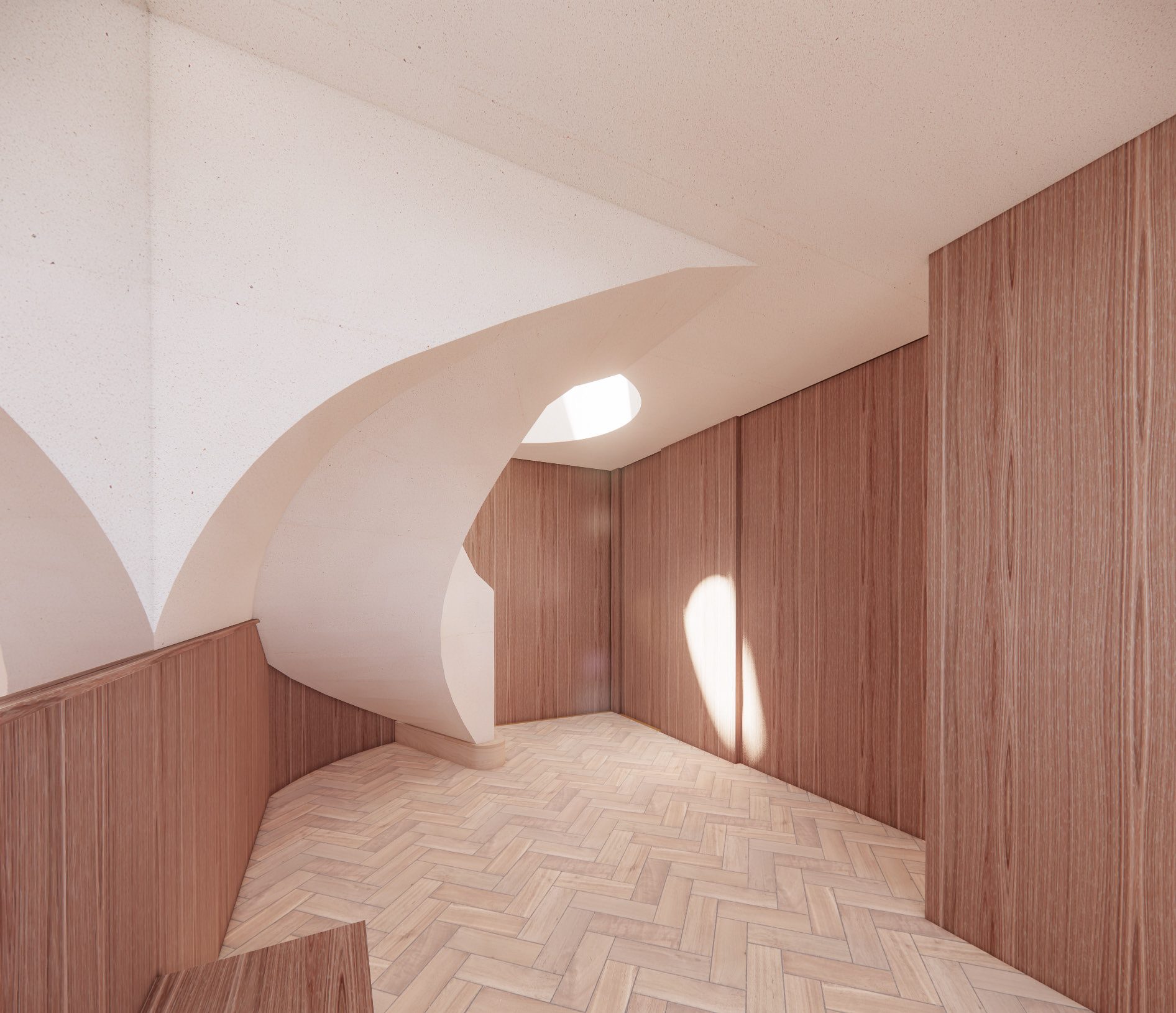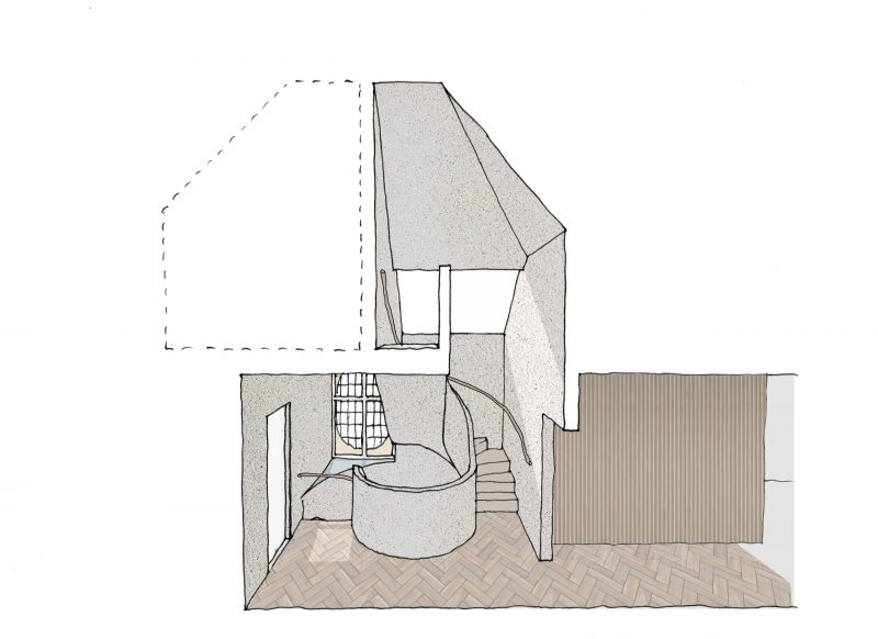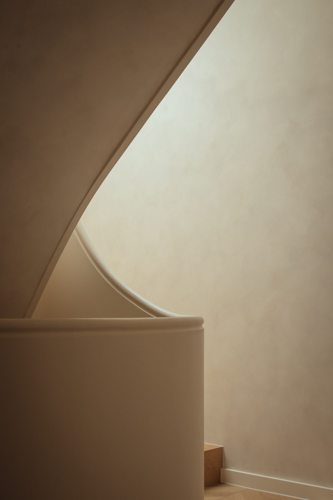 One of the standout features is the ground floor extension, which perches impressively on the corner of the new brick form, adding a touch of architectural drama. There are further features which inspire delight inside – a sculpted staircase winds gracefully from the expanded entrance hall to the loft, with a continuous handrail that leads past an original stained glass window and under a wide opening rooflight. This spiral staircase is not just a functional element but a piece of art, playing with geometry and light to create dynamic visual interest.