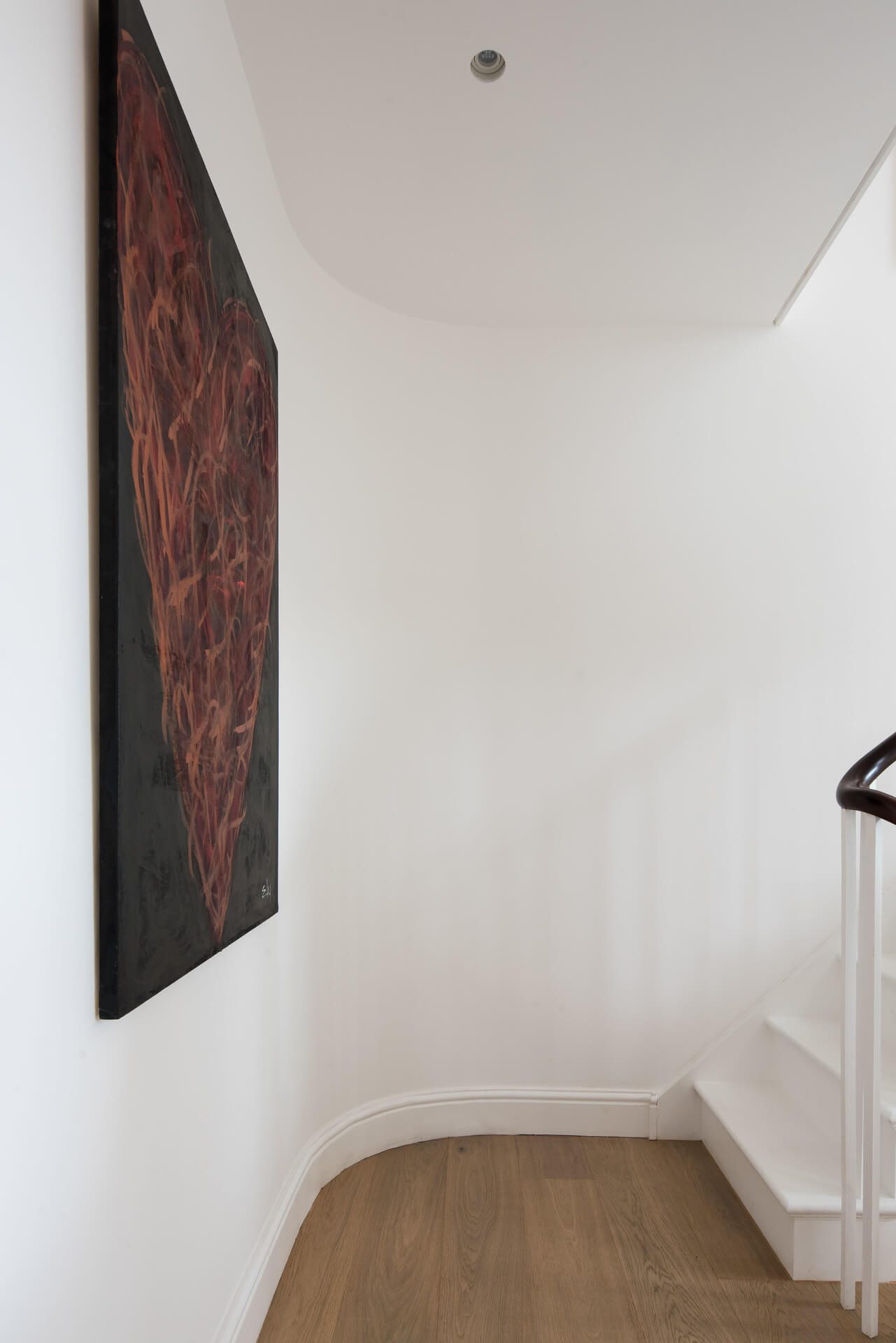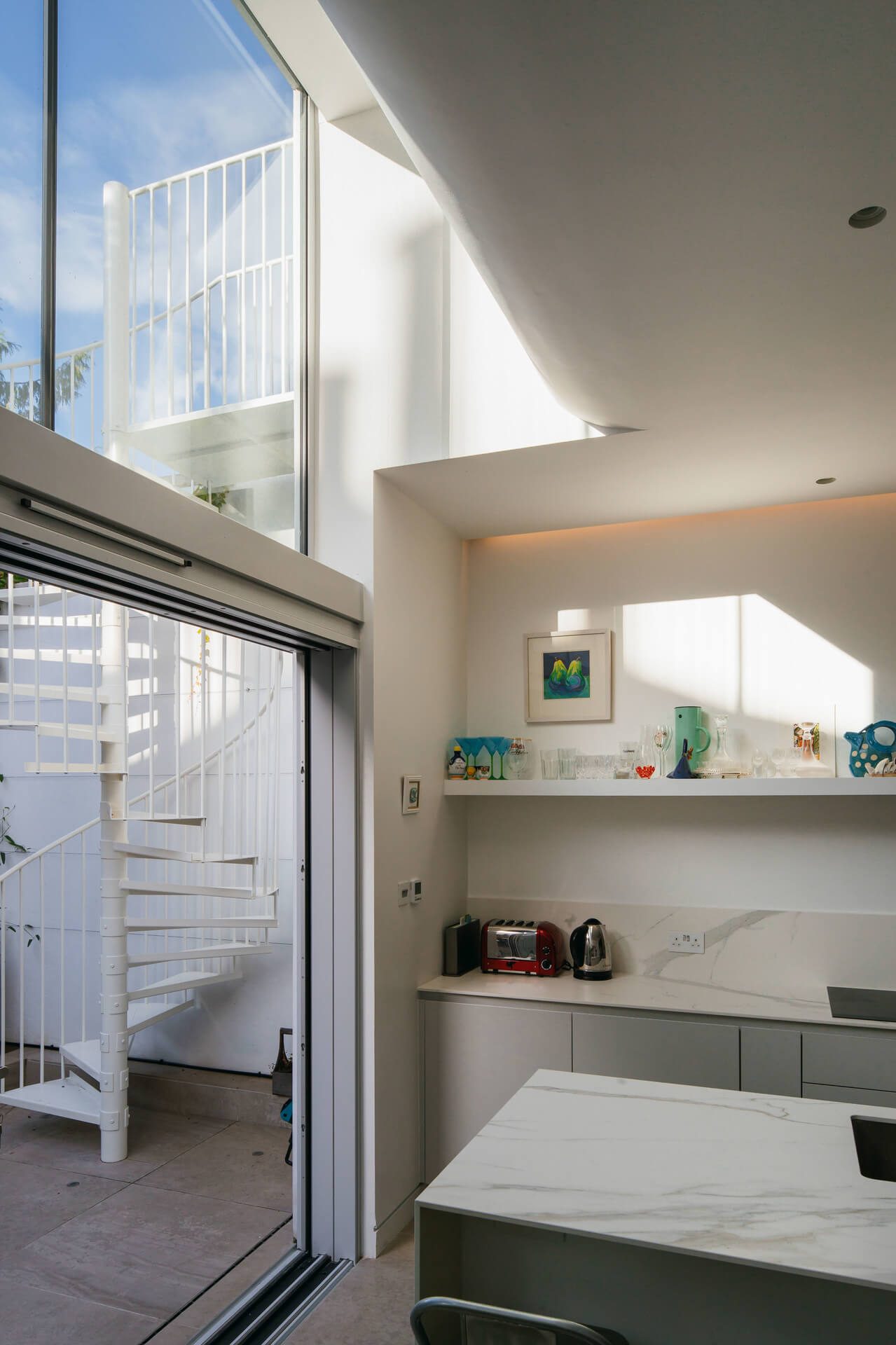 We wanted to find a way to maximise sunlight penetration but also allow privacy from the buildings that overlooked the property to the rear. We found a way to do this by creating a large glazed façade, split into two halves, the bottom allowing access to the garden and the top half placed in front of a large curved plastered ceiling that swooped up to the roof deck – hidden behind a planted wildflower bed. From a small dark pokey kitchen, we created a tall, brightly lit kitchen and dining space with a roof terrace connected to the garden via a slender spiral staircase for our clients to enjoy.
