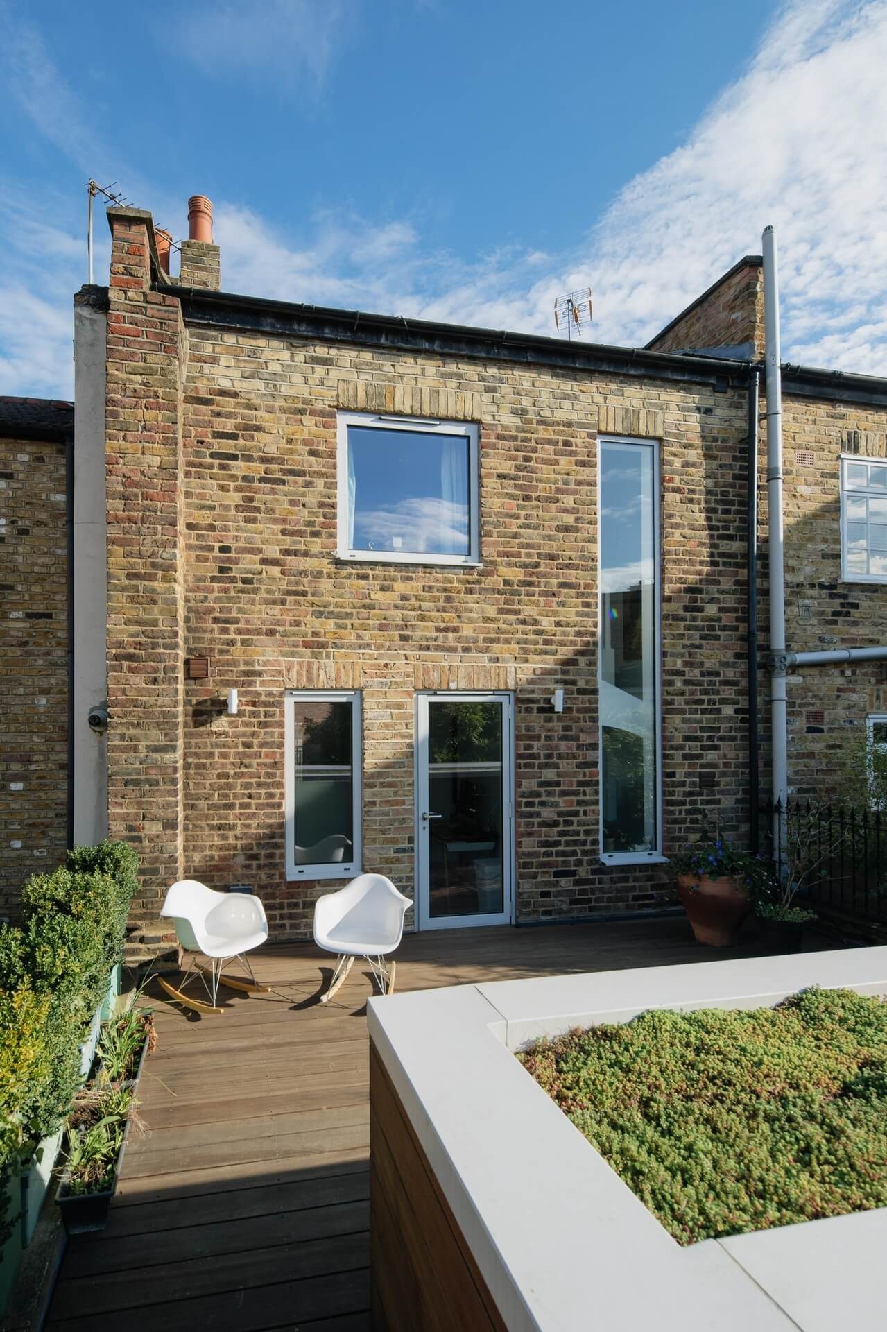 This project is a richly textured transformation of an end of terrace property in the De Beauvoir Conservation area. It was built for a young family and their new born child who arrived at the end of the build. The project is located in the middle of a specific row of terrace buildings on the junction of two roads. The orientation of the rear garden faced north-west and at ground level the opportunities for getting natural light into the deep plan was a challenge.