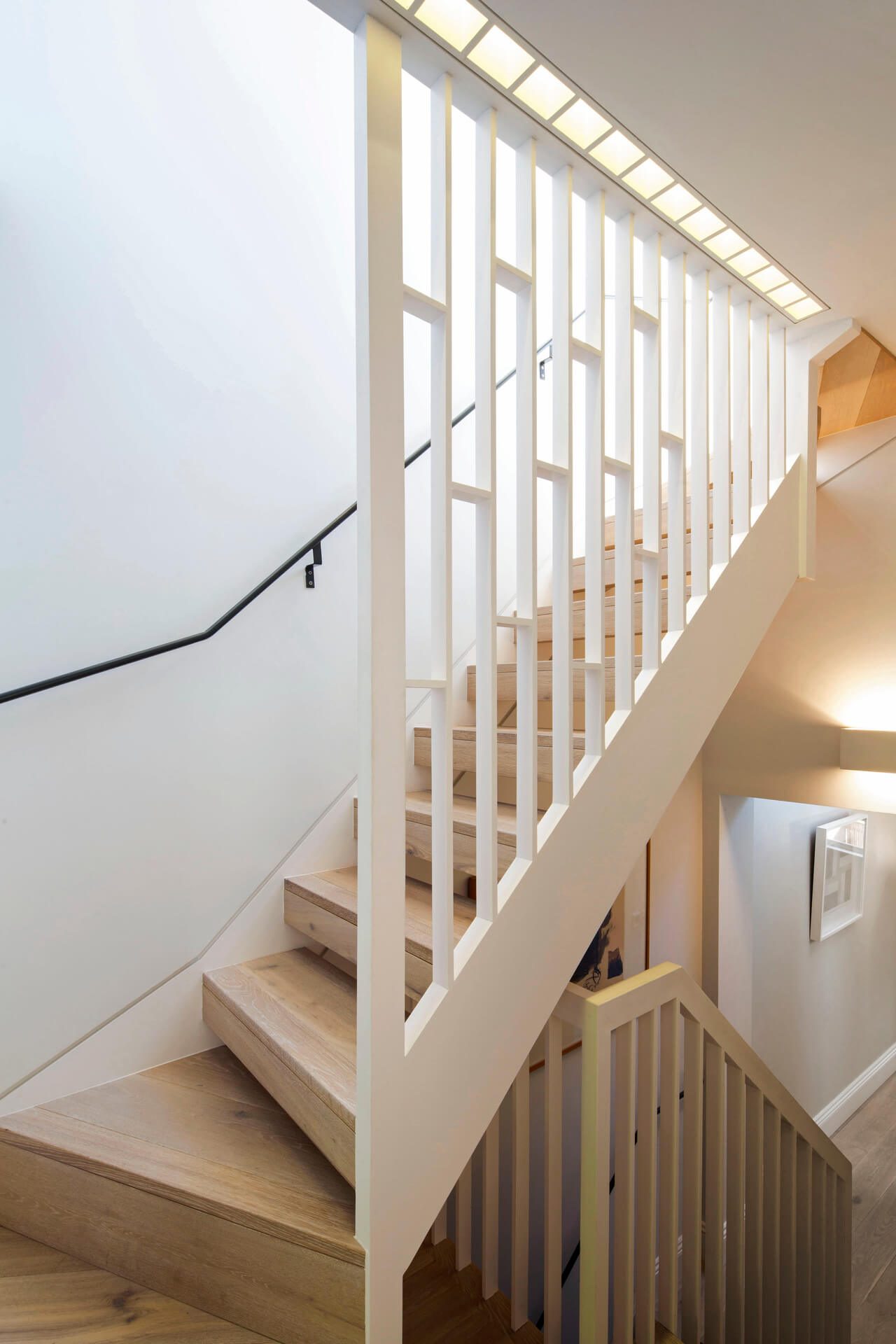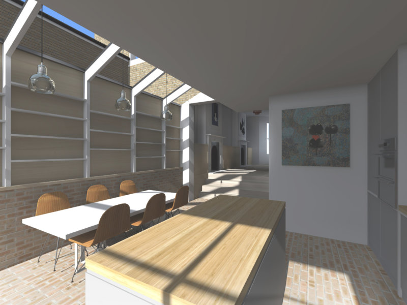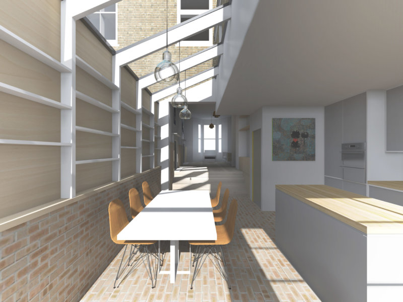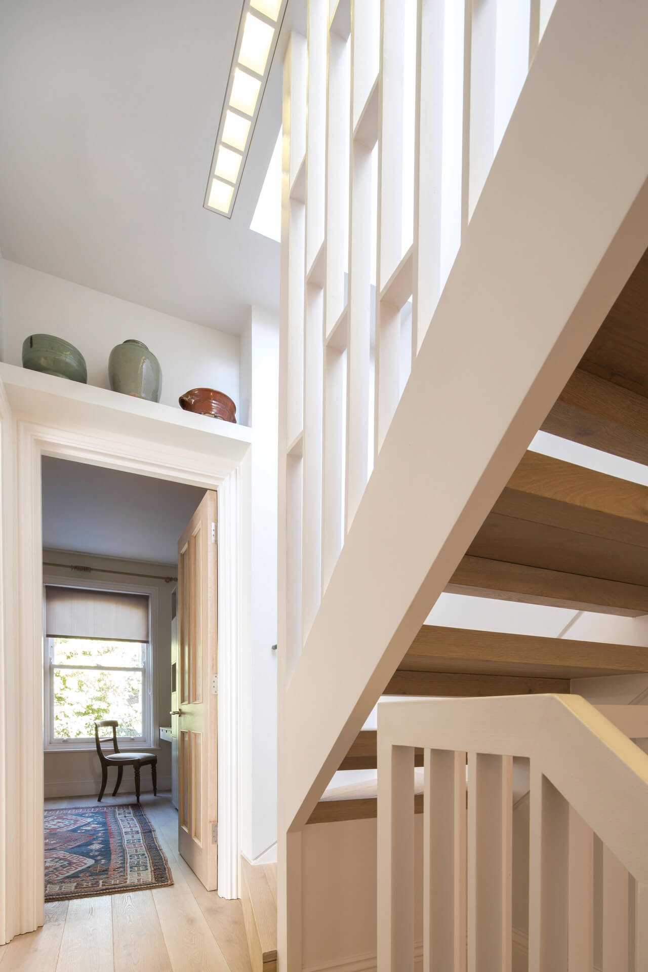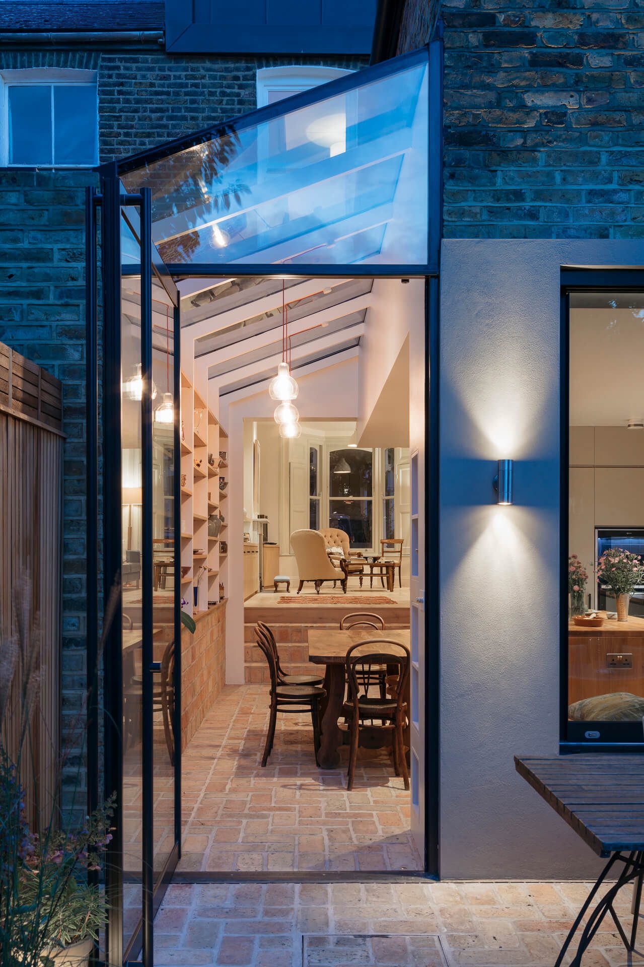 A fully glazed skylight to the side extension allows for increased light levels and improved connections between the spaces linking the front of the house to the rear garden.