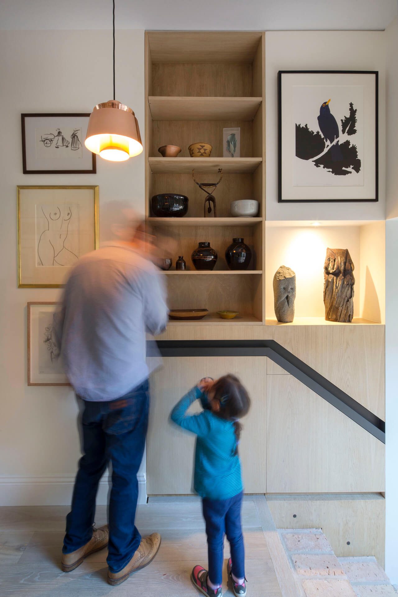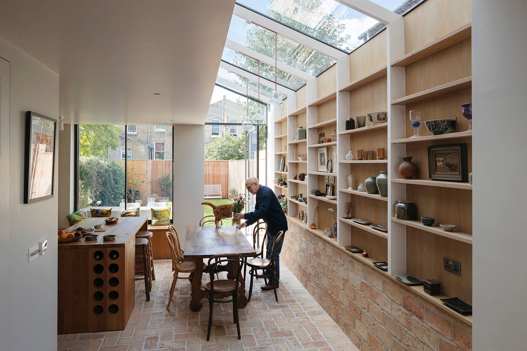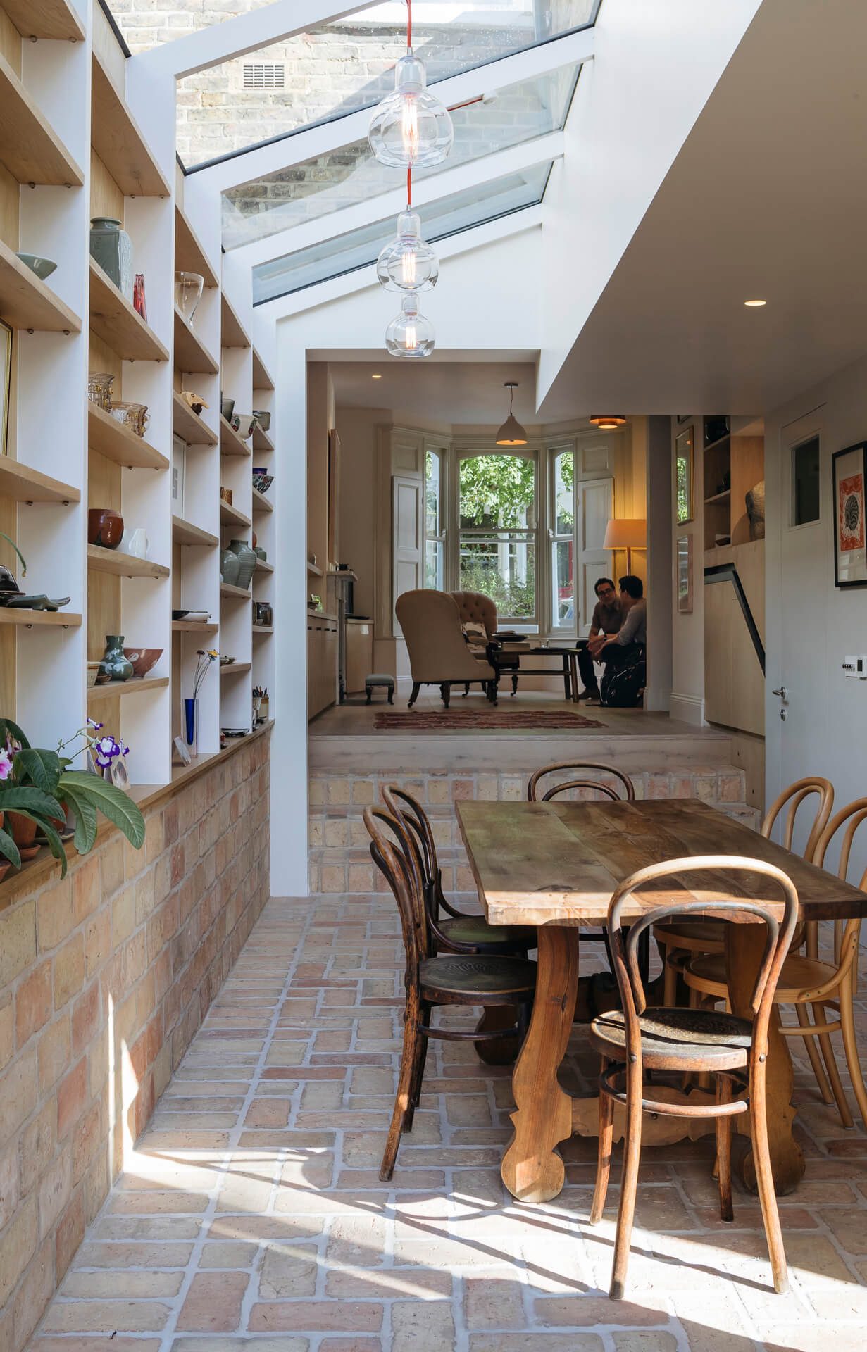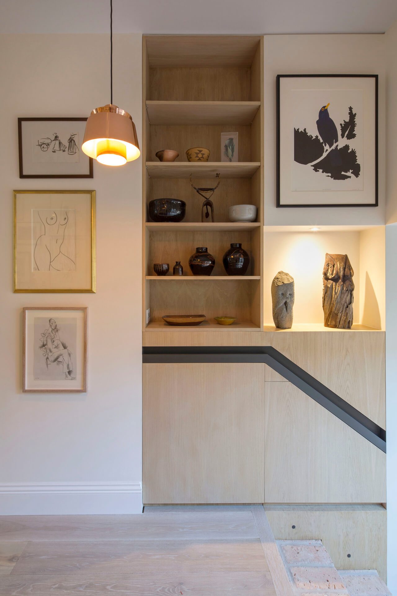A large glass pivoting door enables generous access to the garden. Built in seating in the kitchen provides an informal gathering space facing the garden. A framework of oak shelving and timber rafters gives structure to the new ground floor space providing further display space for art, ceramics and glassware pieces under a bright sun filled fully glazed skylight.