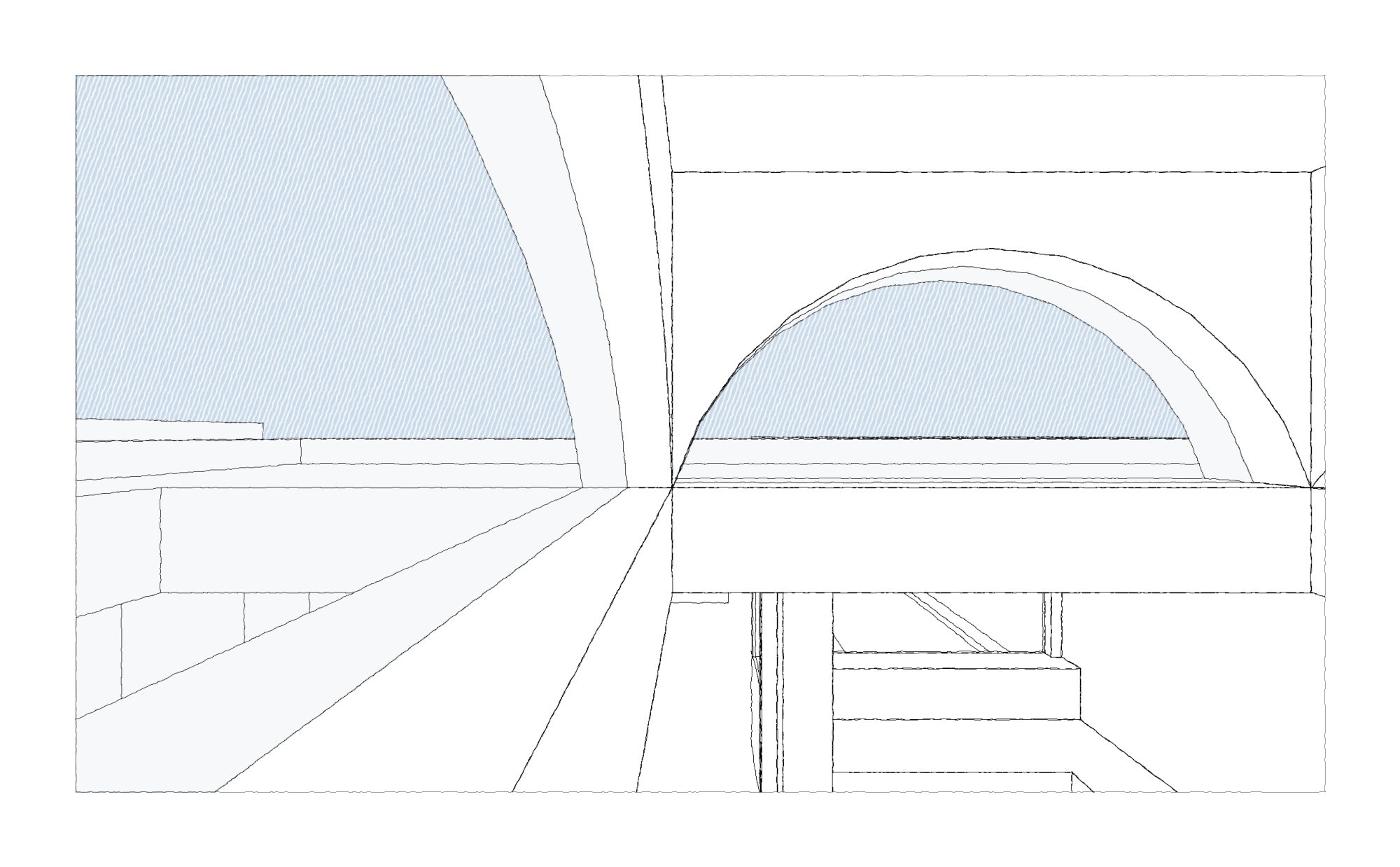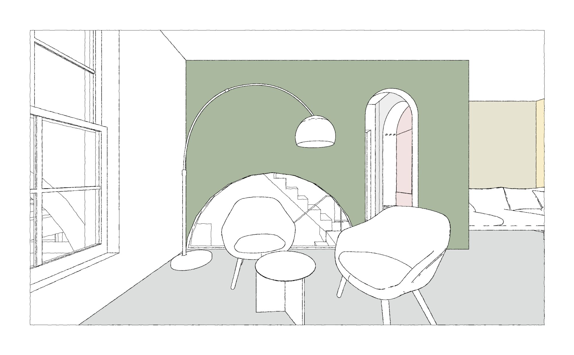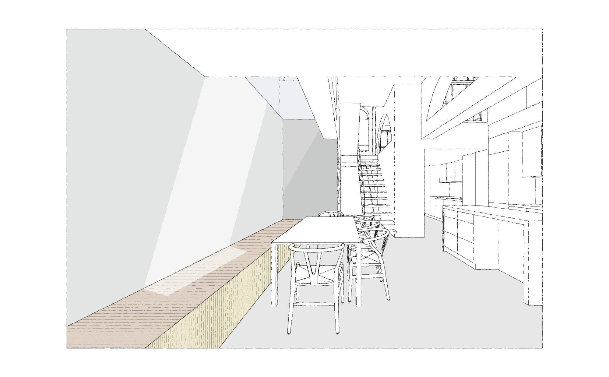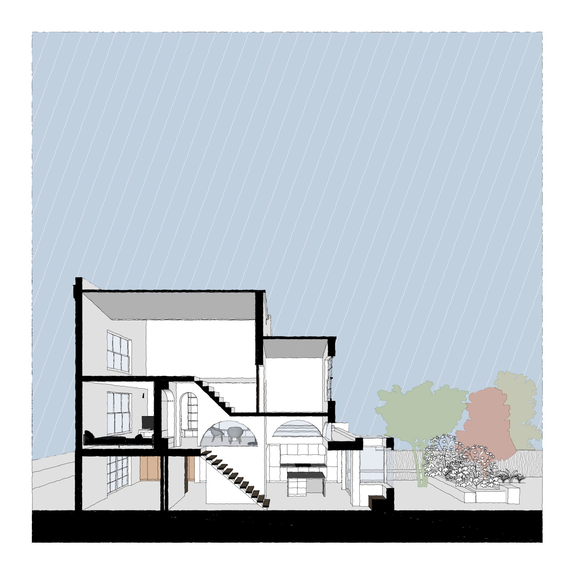 The project connects the upper levels of the house through an open staircase. The facades are punctured by several arched openings bearing on beams creating a repetitive motif of half-moons. These are a mixture of clerestory windows and glazed balustrades which blur the boundaries between internal and external windows. Construction starts early 2025