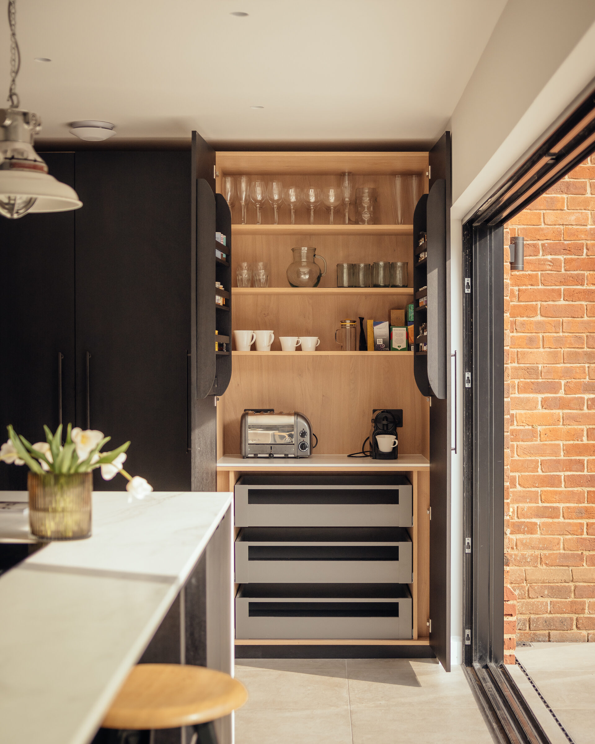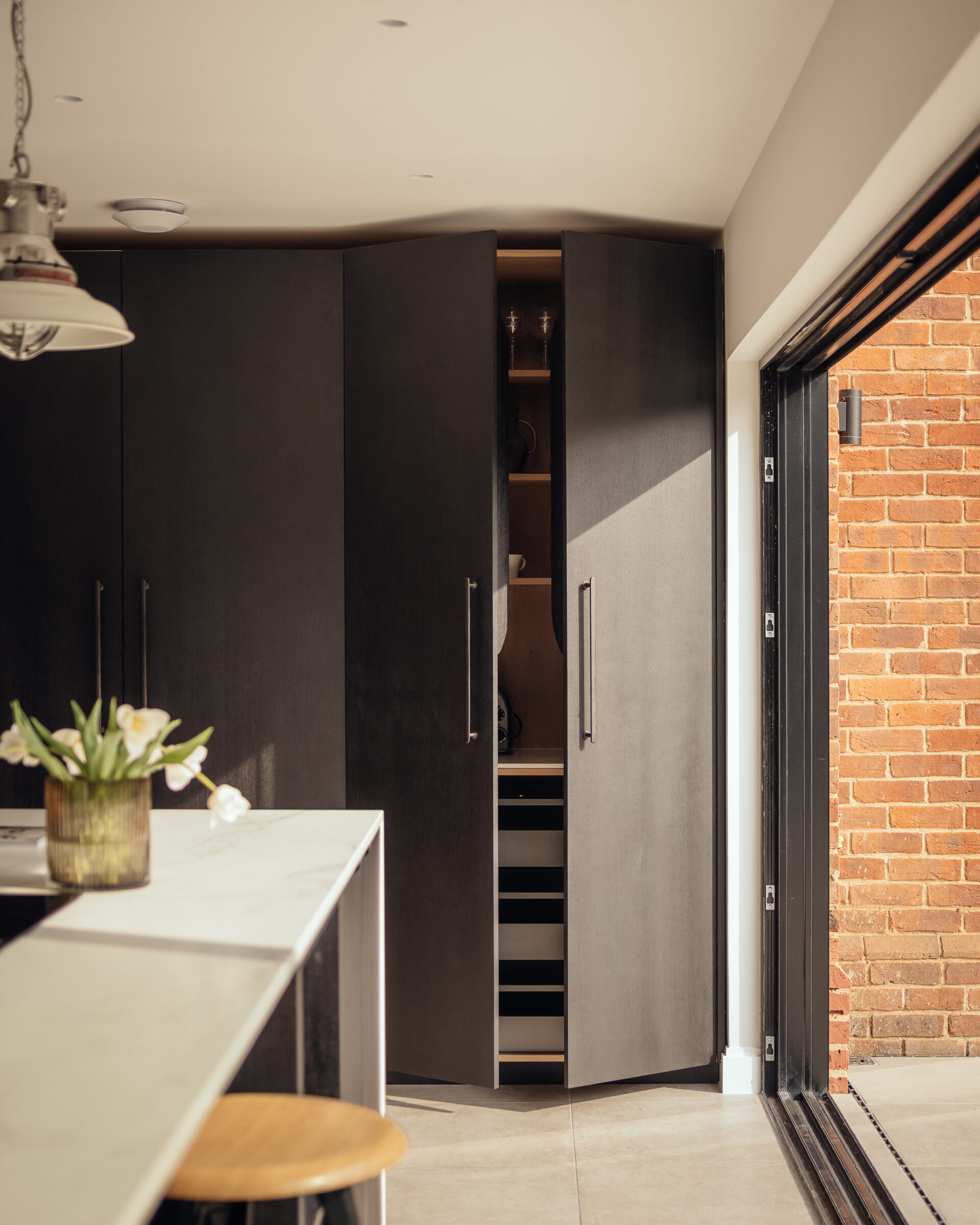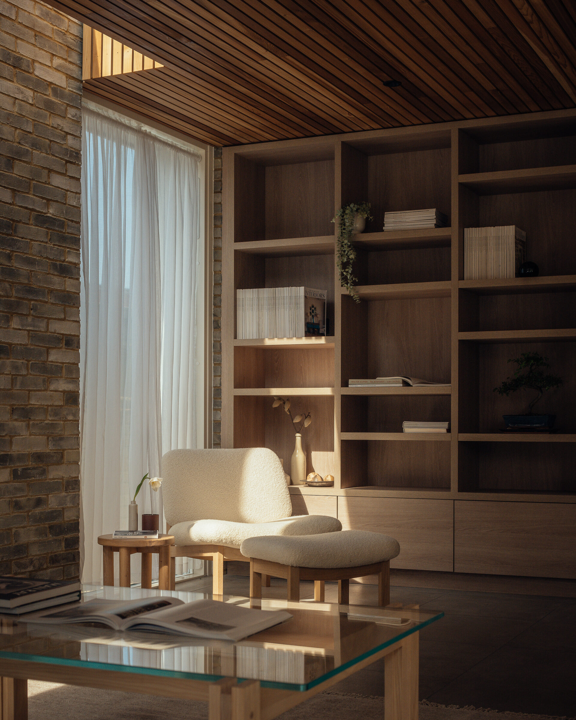 Framed in slender oak fins, the pavilion connects seamlessly to the garden. Inside, a rich material palette of brick, oak, and blackened steel adds depth and tactility. Bespoke furniture by Tamart brings sculptural presence and comfort to the space, further enhancing the sense of character and craft.