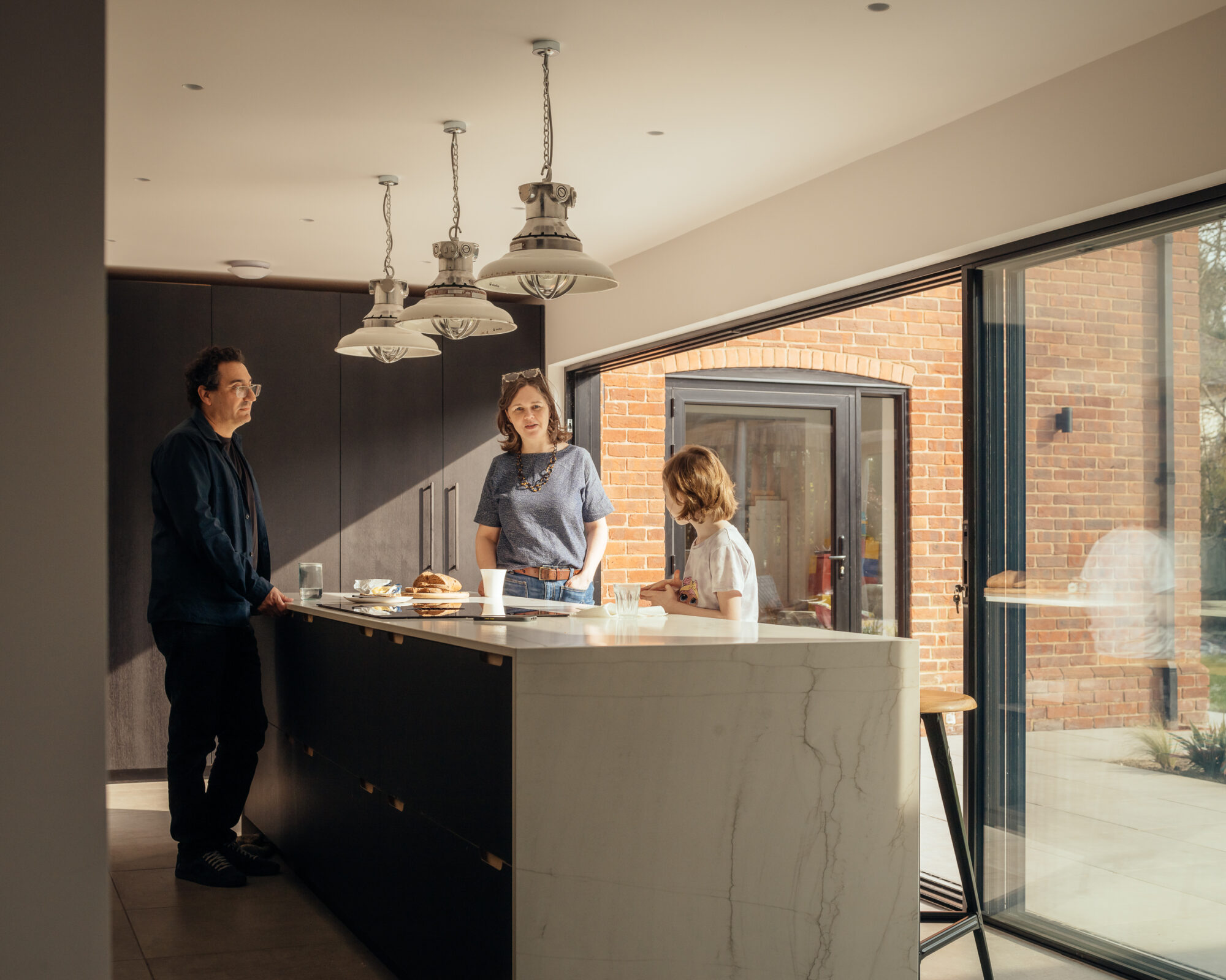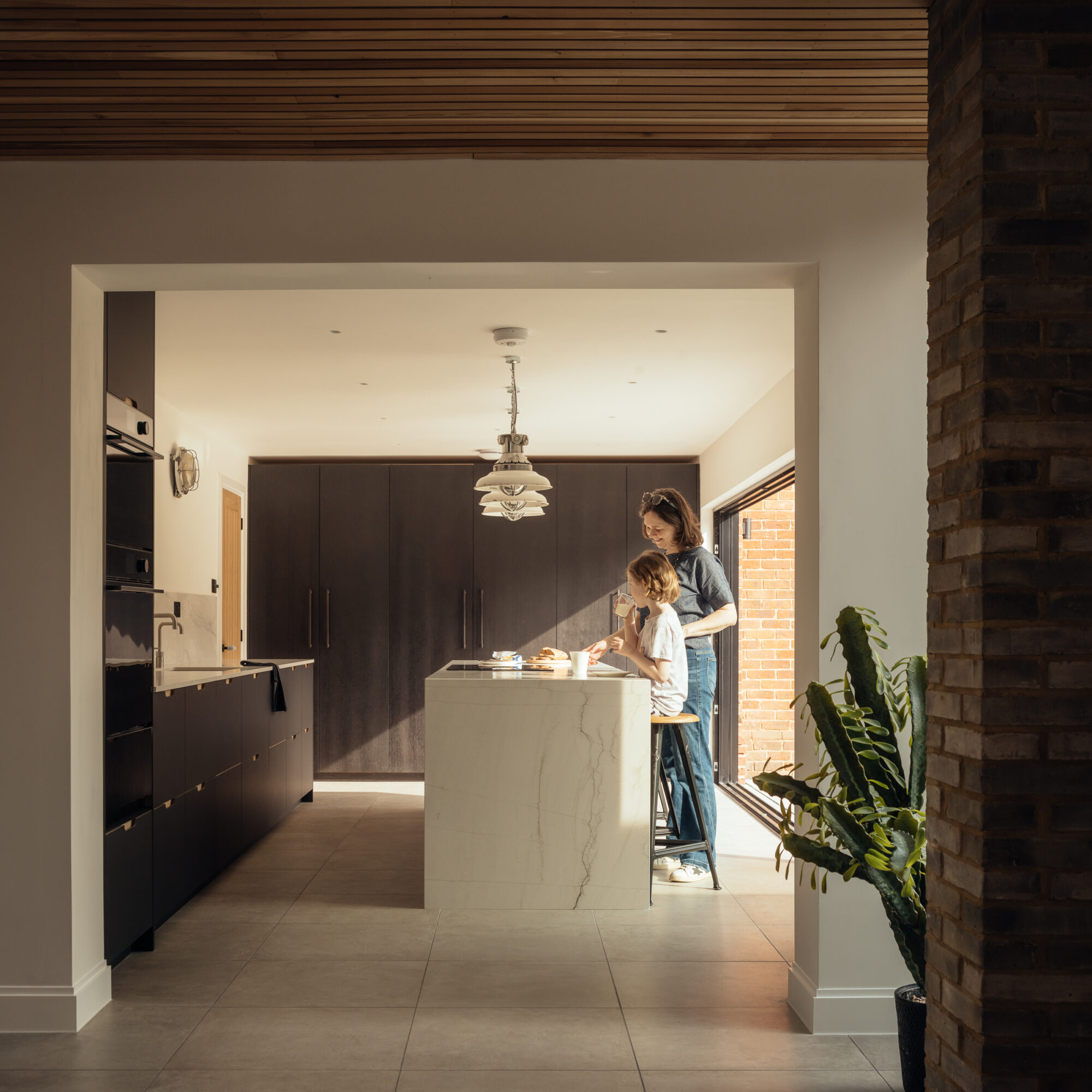 This recently completed project transforms a detached 1990s house within the Hildenborough Conservation Area into a calm, contemporary family home. The brief called for more light, flow and usable indoor and outdoor space. Our response was a low-slung garden pavilion extension that re-centres the house around a new heart: a warm, timber-lined room for gathering, cooking and everyday living.
