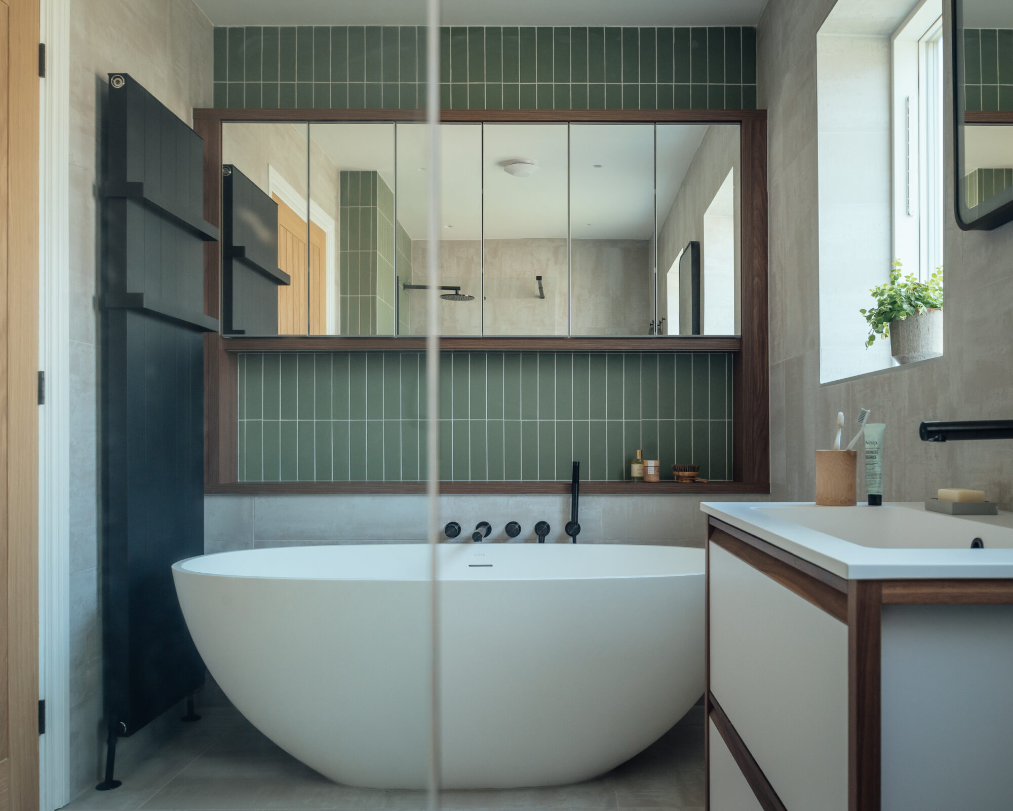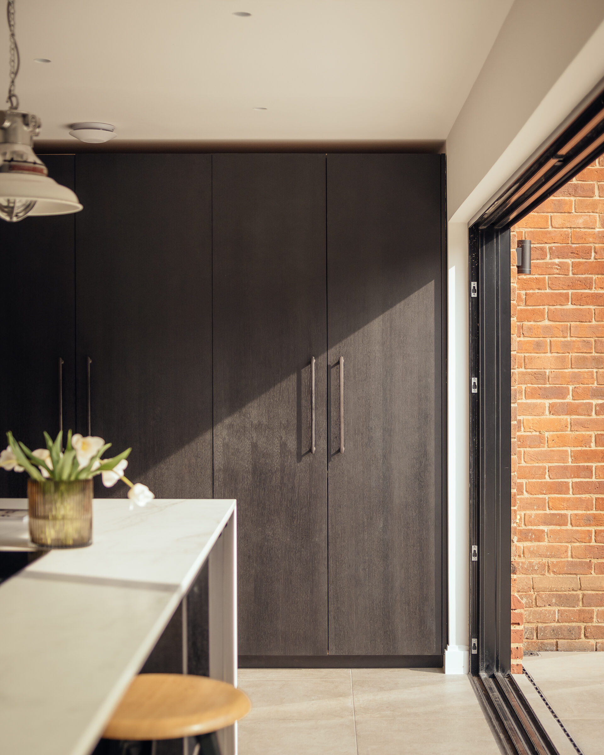 Sliding glass doors dissolve the threshold between interior and landscape. Powered by an air source heat pump and fitted with triple-glazed windows, the house performs efficiently year-round. A two-storey infill houses a new laundry room and ensuite. Fully refurbished throughout, the home now offers flexible zones for family life—quiet moments, noisy play, work, and rest.