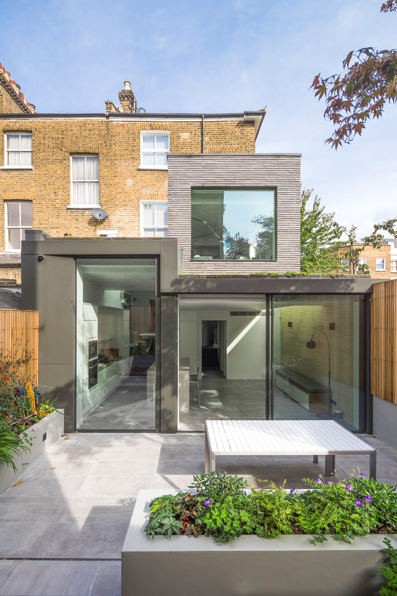 The rear extension to the property is visible from a side road and the design strategy was to construct the extension out of a beautifully hand-crafted dark brick. It was critical to ensure that the new modern insertion was subservient to the host Victorian building. The long, elongated module draws reference to the materiality of the host building but through using a different colour and brick size, brings a different identity to the original Victorian terrace house, allowing it to retain its original character.