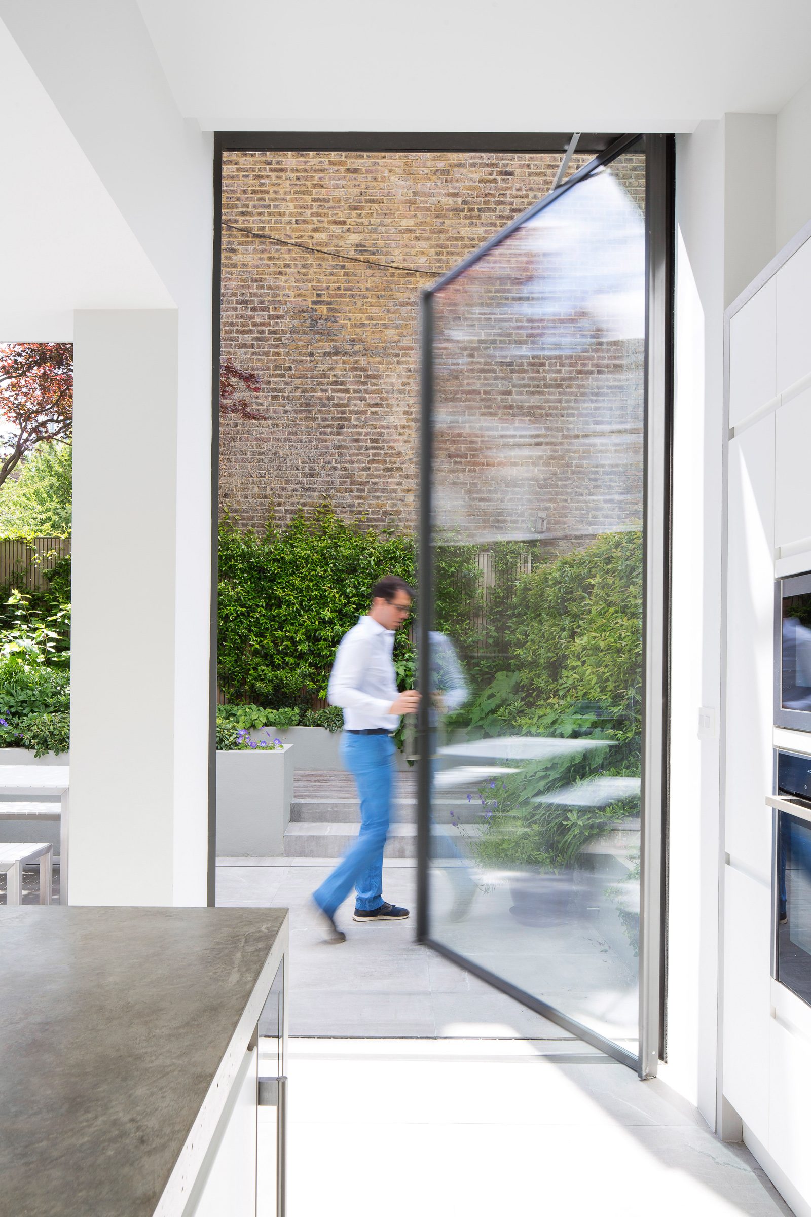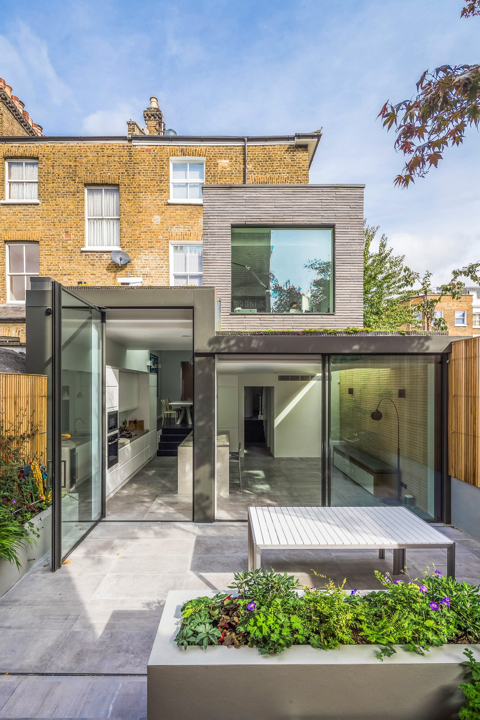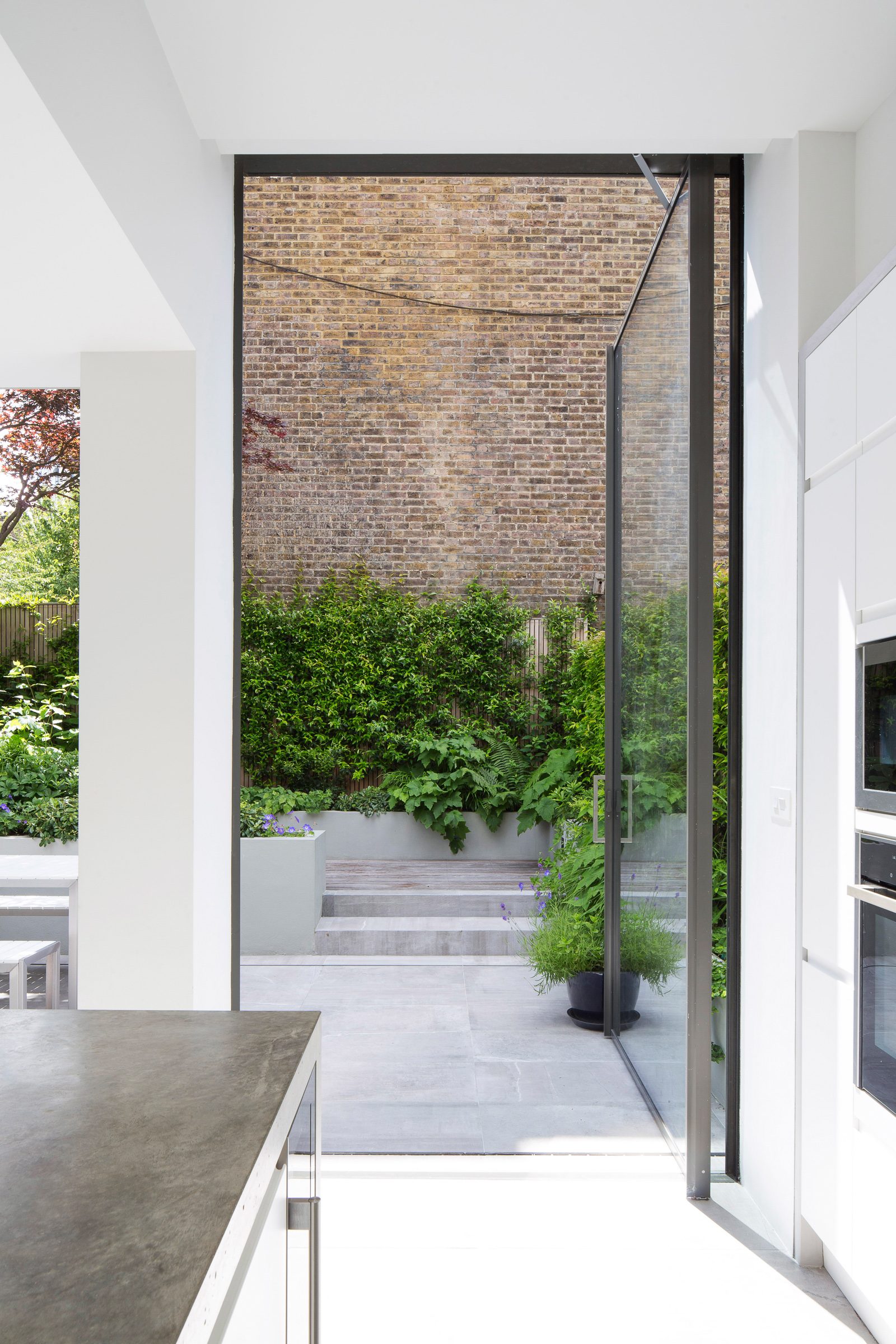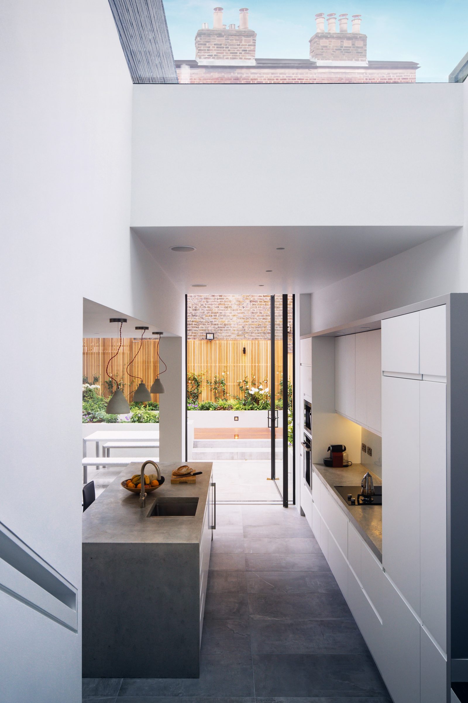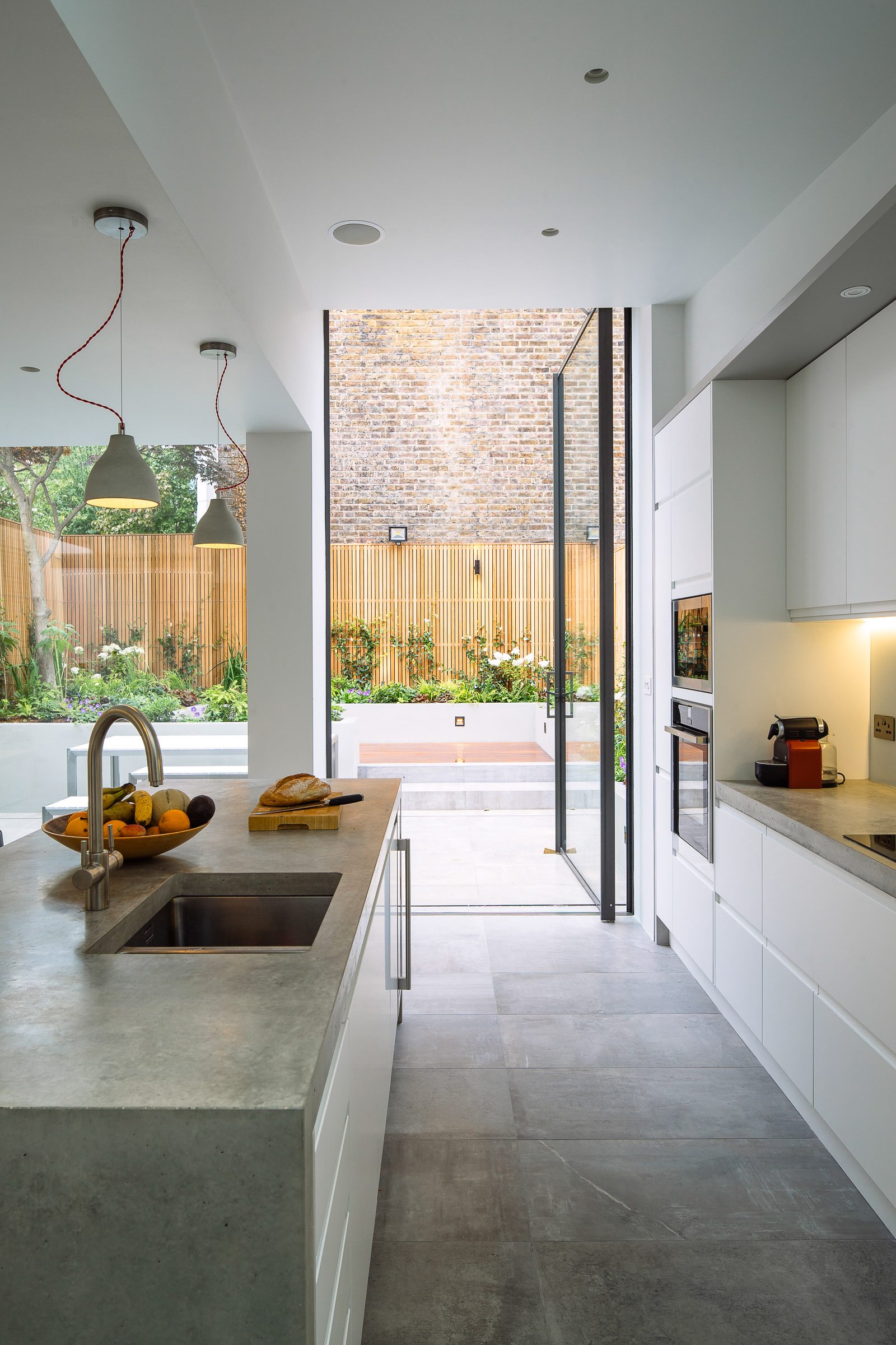The modern open kitchen/ living space is linked to the rear garden through a large stepped aluminium portal with large glazed openings bringing light in and creating a frameless threshold between inside and outside; linking house and garden together.