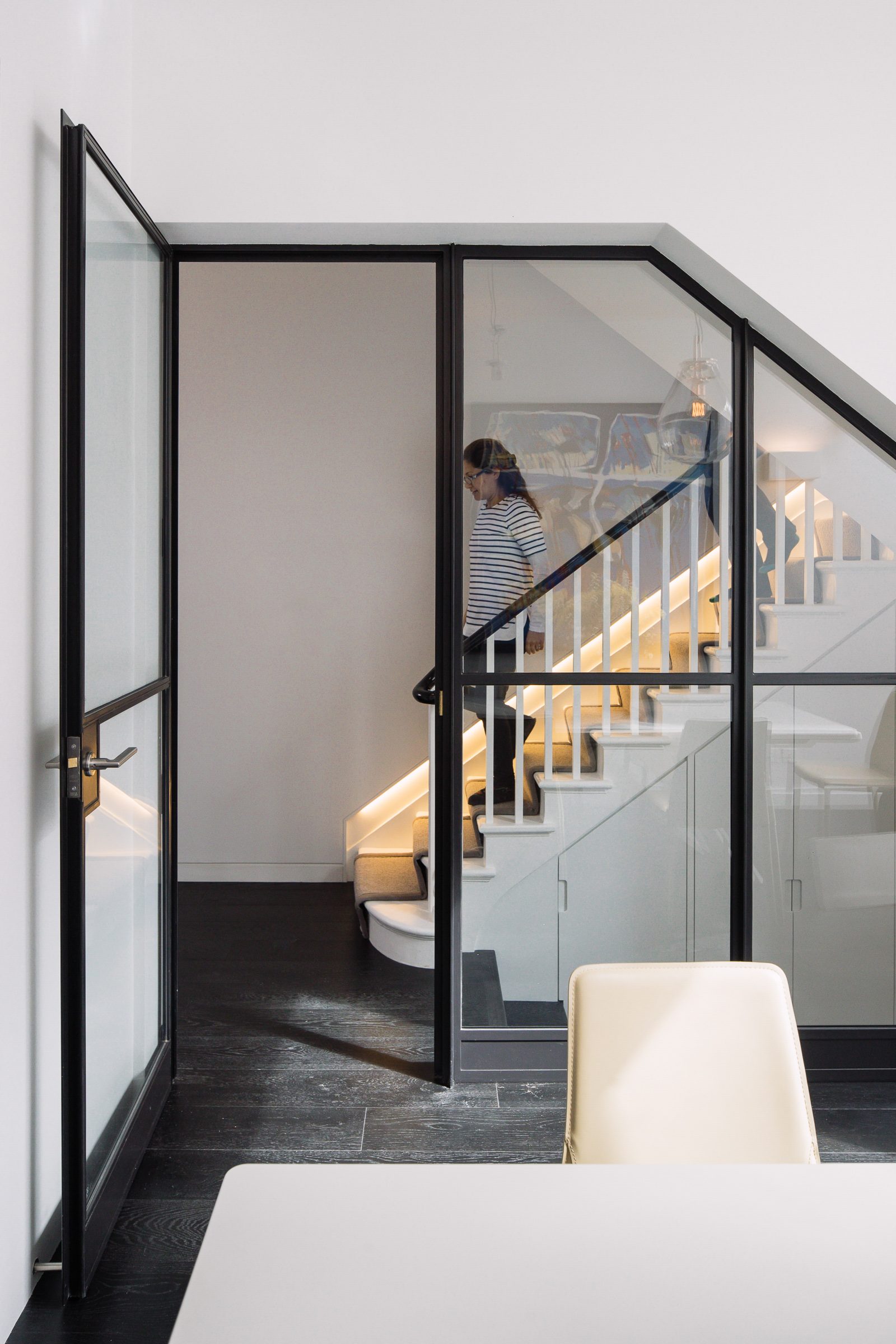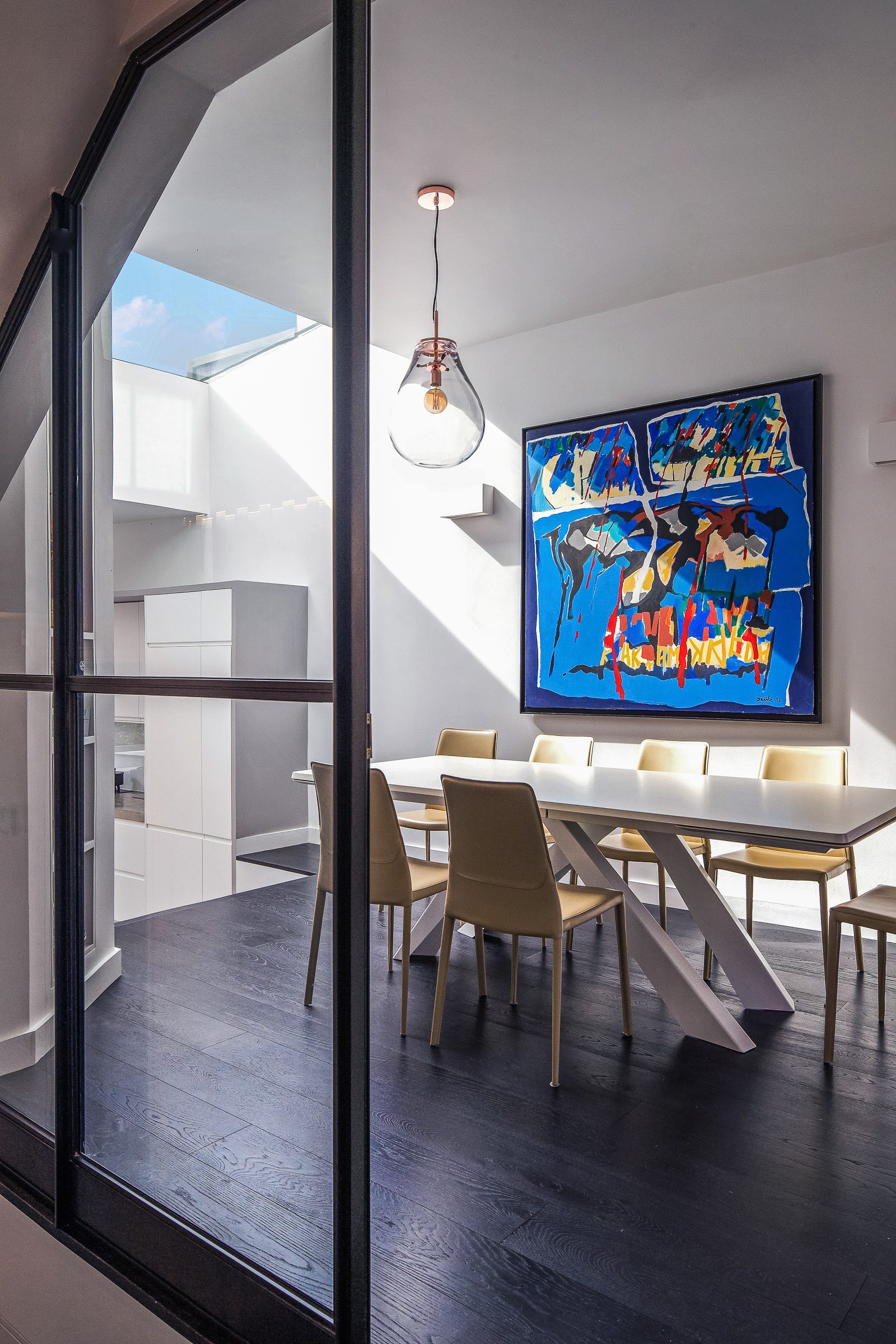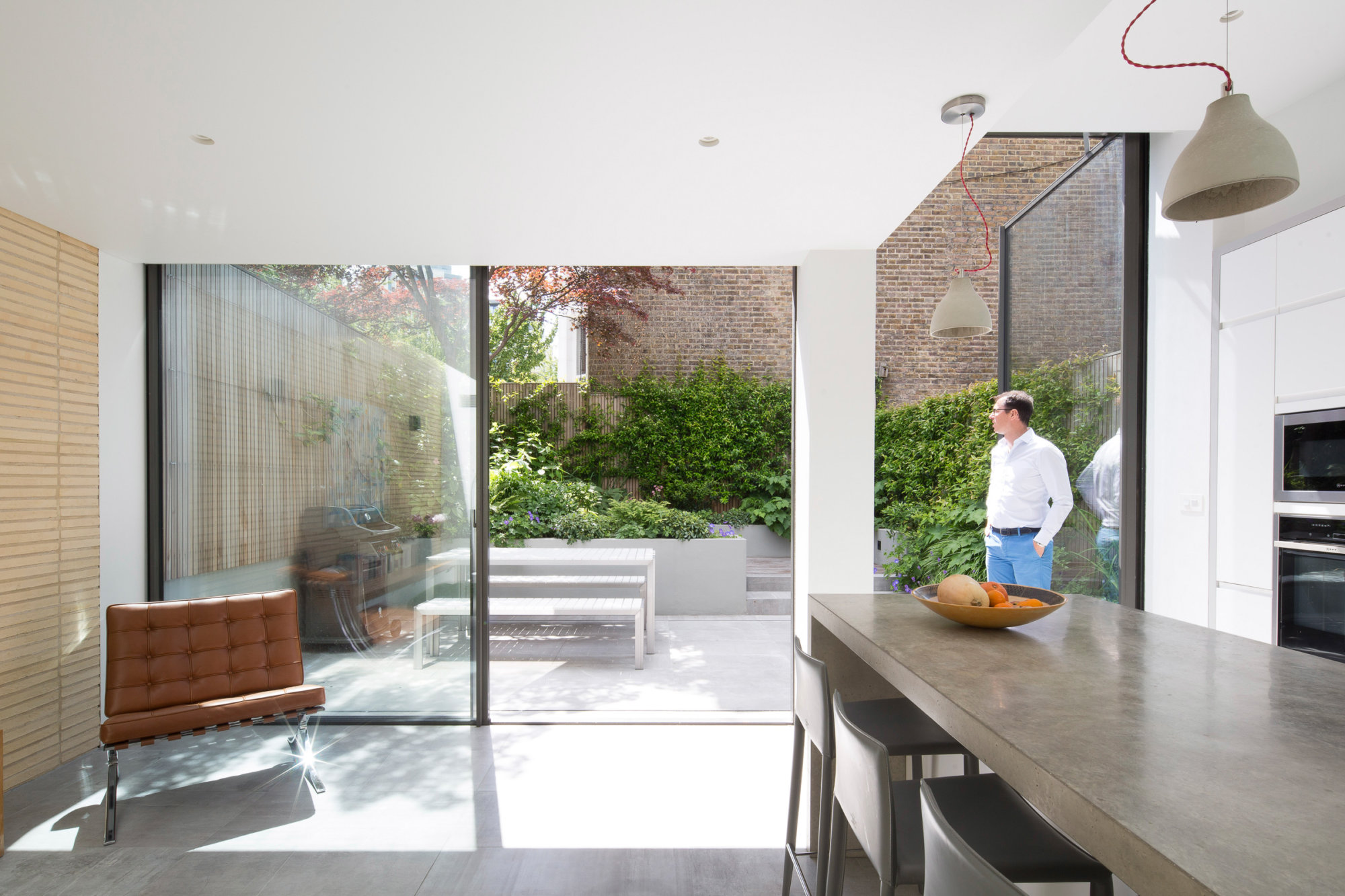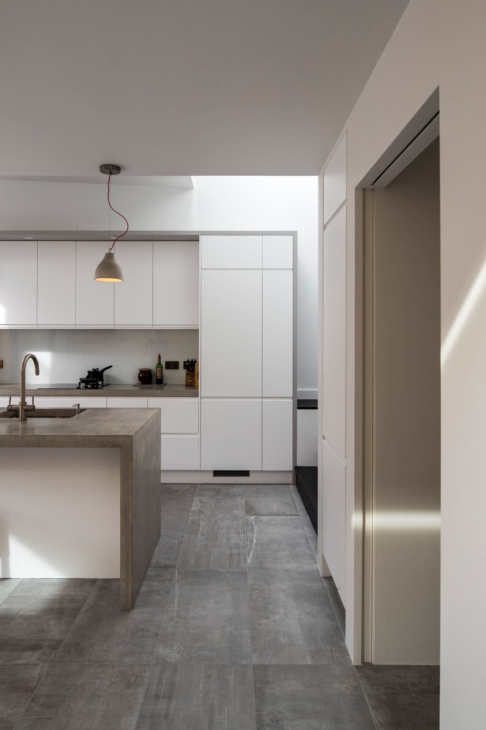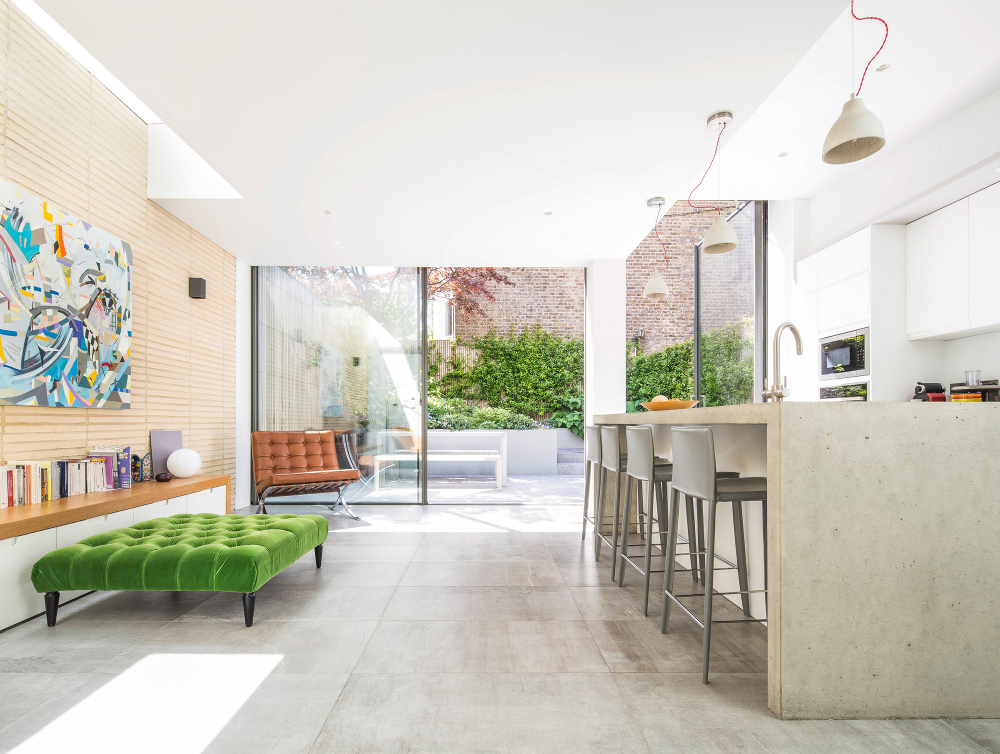 The modern open kitchen/ living space is linked to the rear garden through a large stepped aluminium portal with large glazed openings bringing light in and creating a frameless threshold between inside and outside; linking house and garden together.