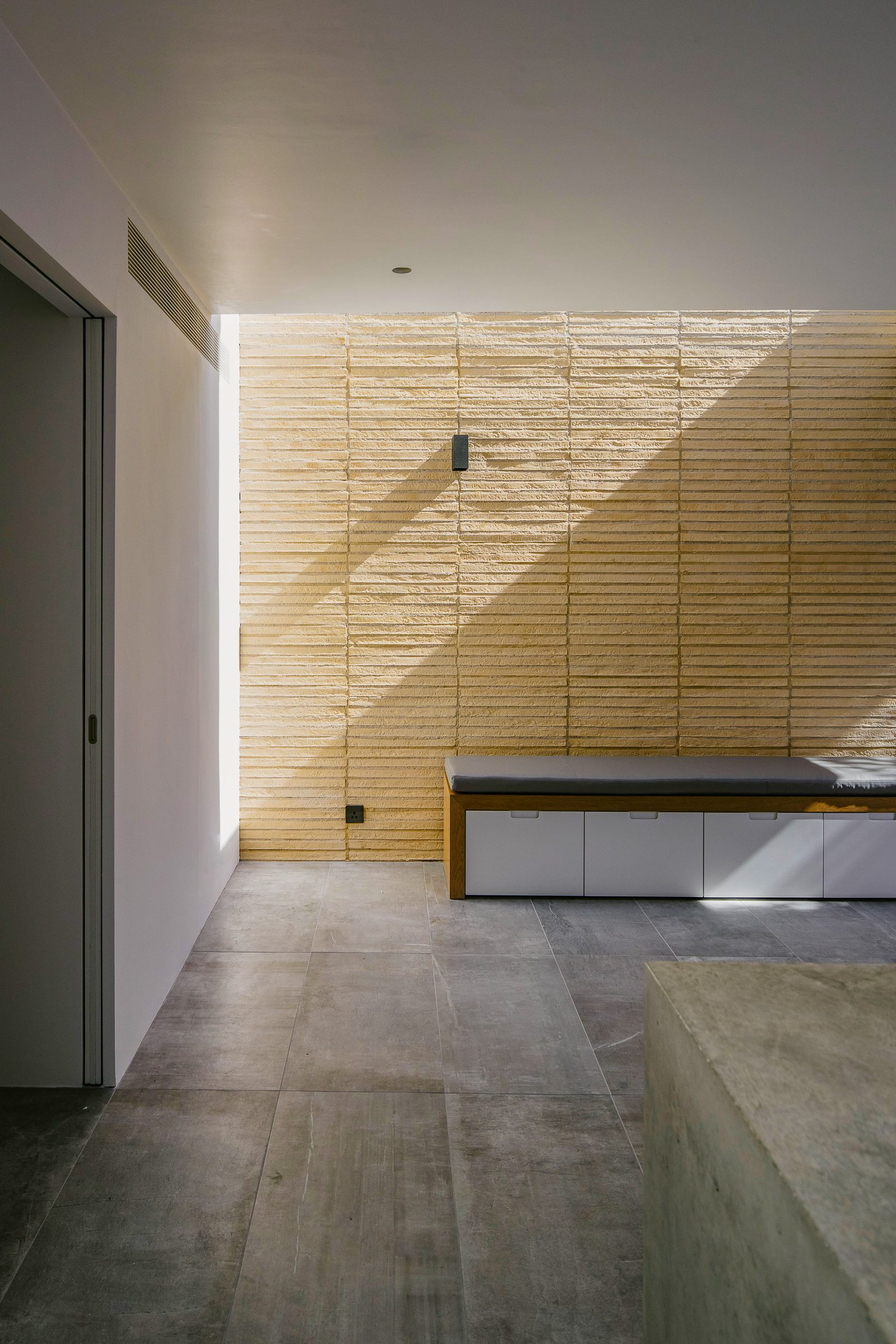 The hand-made elongated brick is continued internally to the flank wall, in stacked bond, drawing the eye up to a large skylight catching the morning light. Internally, a material palette of natural stone floor tiles, warm elongated brick, bespoke concrete worktop, rich oak flooring and sharp white walls give a contrast to the original time-worn exterior of the existing building.