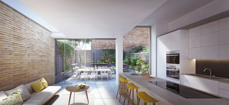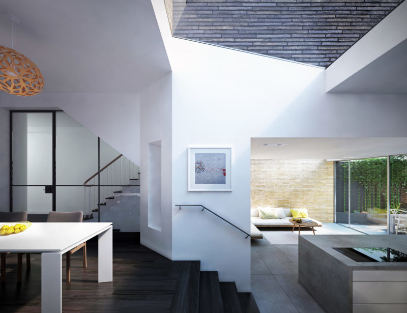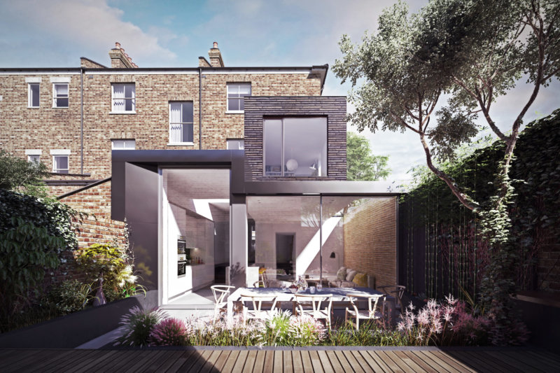 Our client’s brief was to provide a new naturally lit living space for their young family to grow, with a study space for them to work at home. The design of the proposal is centred around simplistic volumes, natural light. It will be built from high-quality, hand-crafted materials. The dark brick colour to the exterior of the first-floor study extension draws reference to the tone and richness of the existing weathered side elevation.