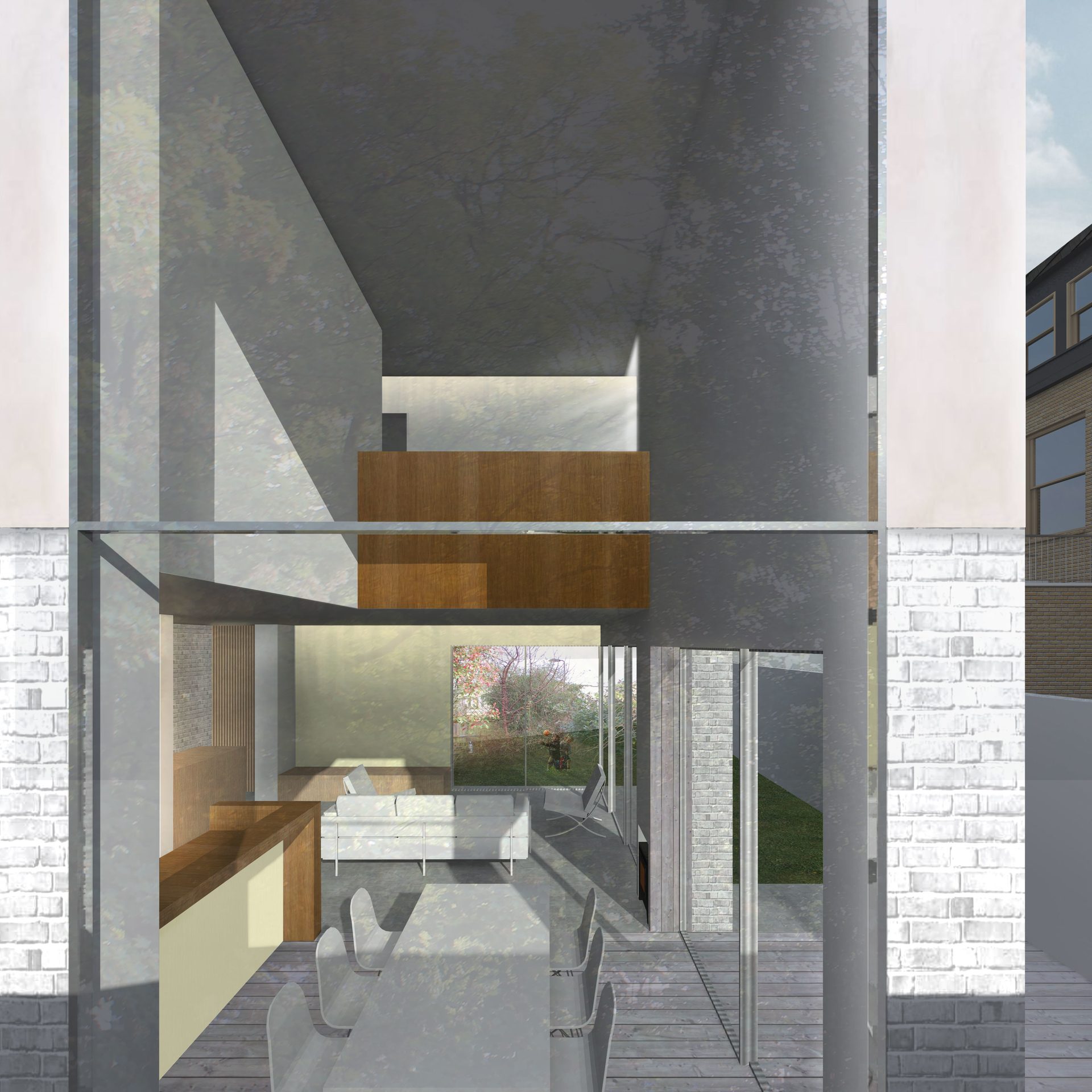 The proposal will demolish the existing property to be replaced with a sustainable three-storey house. The form of the building is driven by the existing urban grain of the site, which is located at the convergence of two roads, creating an angular plot. The building responds to these two geometries to enhance the existing streetscape. The house will use advanced sustainable technologies to meet the AECB Silver Standard for sustainability creating a low-energy and high-performing house.