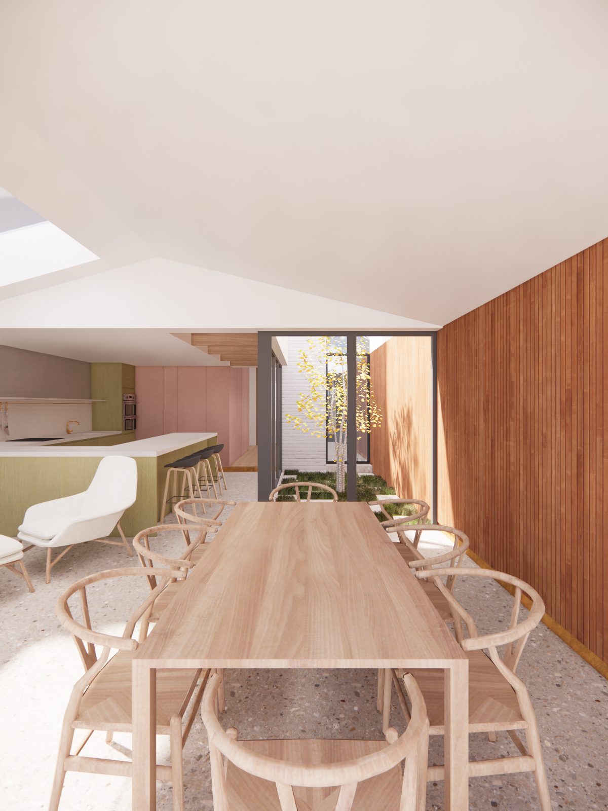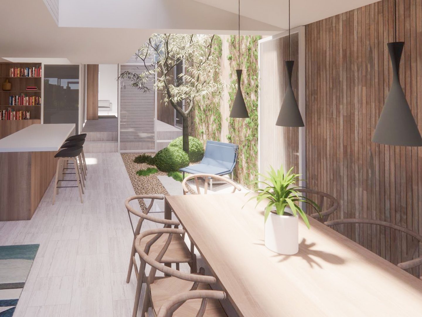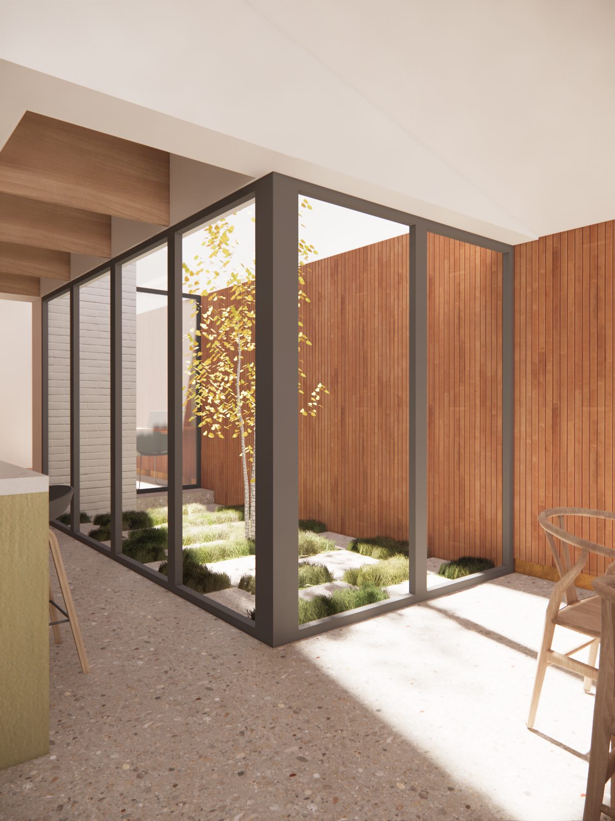 Building on themes explored in our Tree View House project we are placing an external courtyard at the heart of the plan, which provides a focal point for the open plan living, kitchen, and dining spaces. In the summer glazed doors can be opened to make the external courtyard feel like part of the internal space. Working with Landscape Designer Juliet Hutt, our aim is to create a calm and relaxing space that blurs the boundary between external and internal spaces.