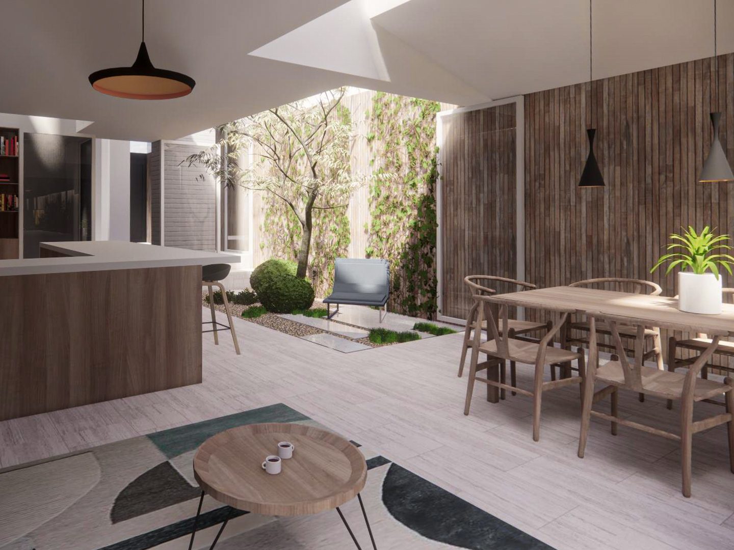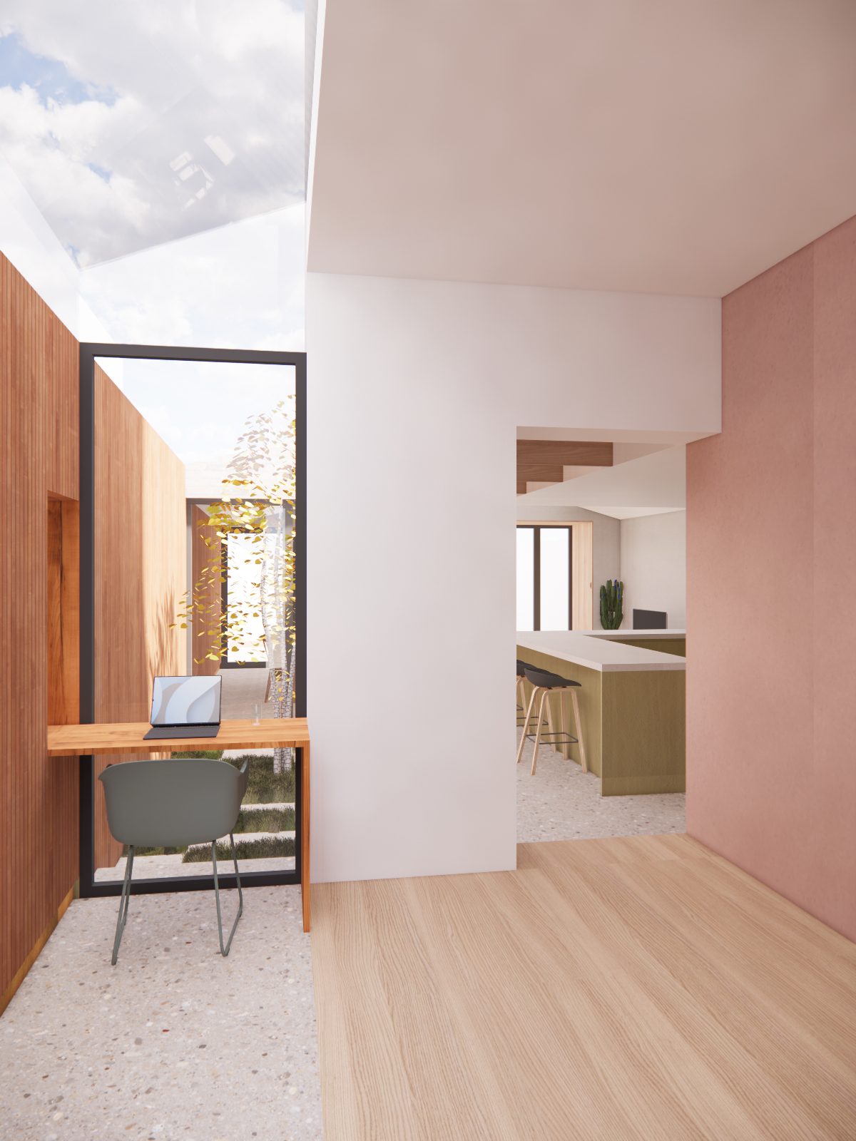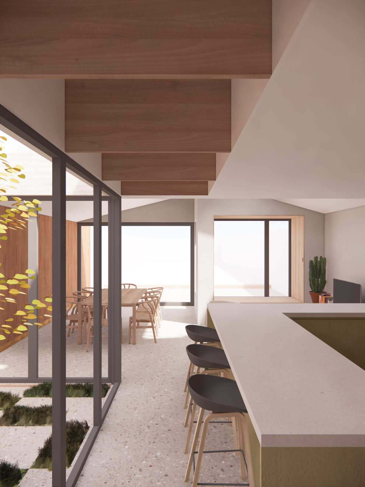 Building on themes explored in our Tree View House project we are placing an external courtyard at the heart of the plan, which provides a focal point for the open plan living, kitchen, and dining spaces. In the summer glazed doors can be opened to make the external courtyard feel like part of the internal space. Working with Landscape Designer Juliet Hutt, our aim is to create a calm and relaxing space that blurs the boundary between external and internal spaces.